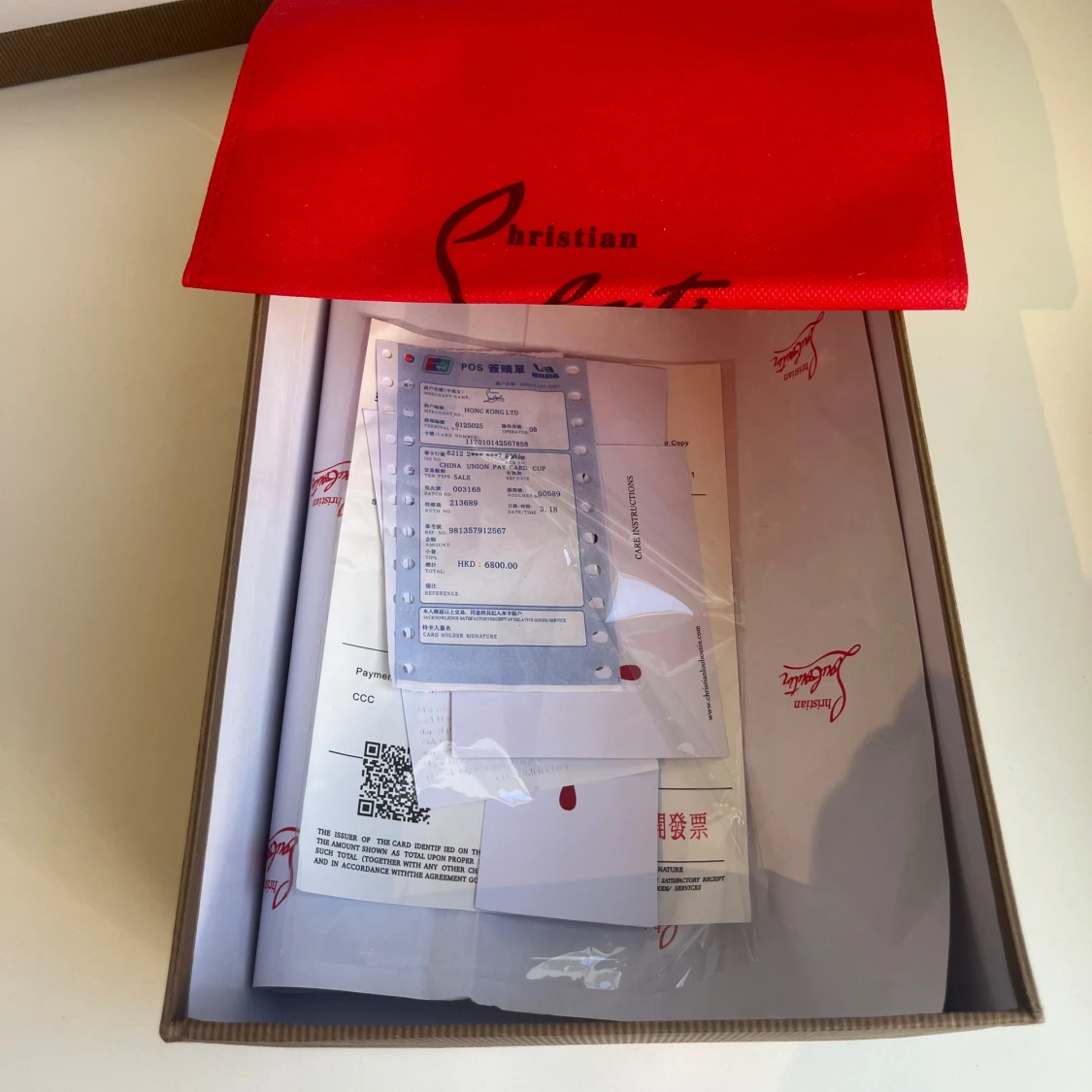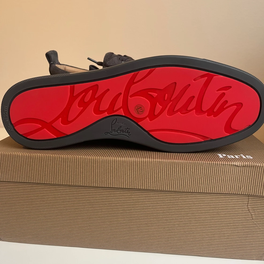 Snygga sneakers från Christian Louboutin i mörkgrå mocka med klassisk röd sula och rund tå. Skorna har snörning och en stilren design som sticker ut med den ikoniska röda undersidan. Perfekta för dig som vill ha något exklusivt och trendigt. Hör av er vid någon fråga eller vill ha en extra bild! Priset kan diskuteras vid snabb affär!✅