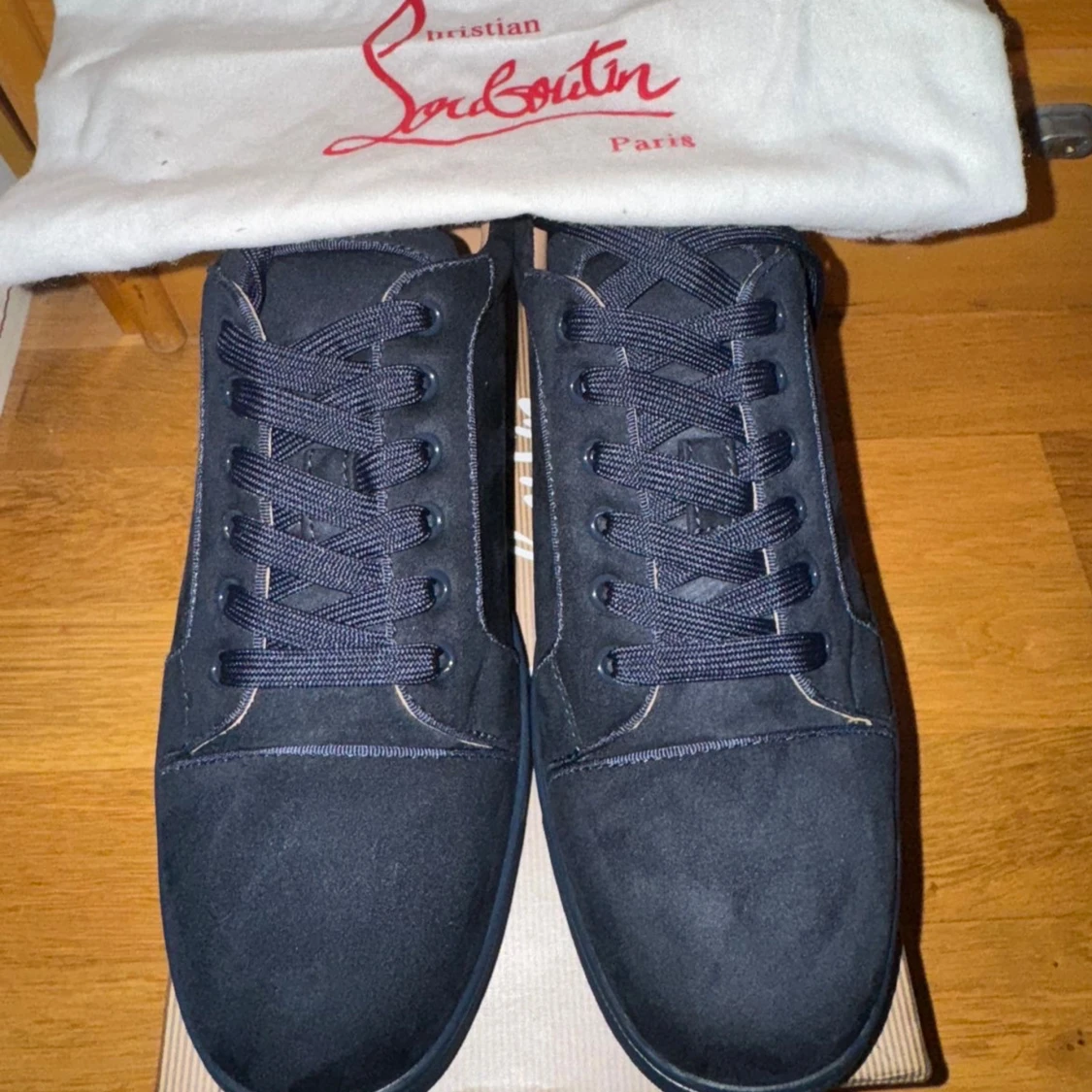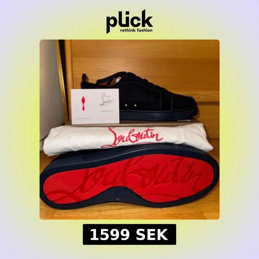 Snygga svarta sneakers från Christian Louboutin i mocka med klassisk röd sula och diskreta nitar på sidan. Skorna har rund tå, platt sula och snörning. Kommer med originalkartong, dustbag och äkthetskort. Perfekta för dig som vill sticka ut med exklusiv stil.