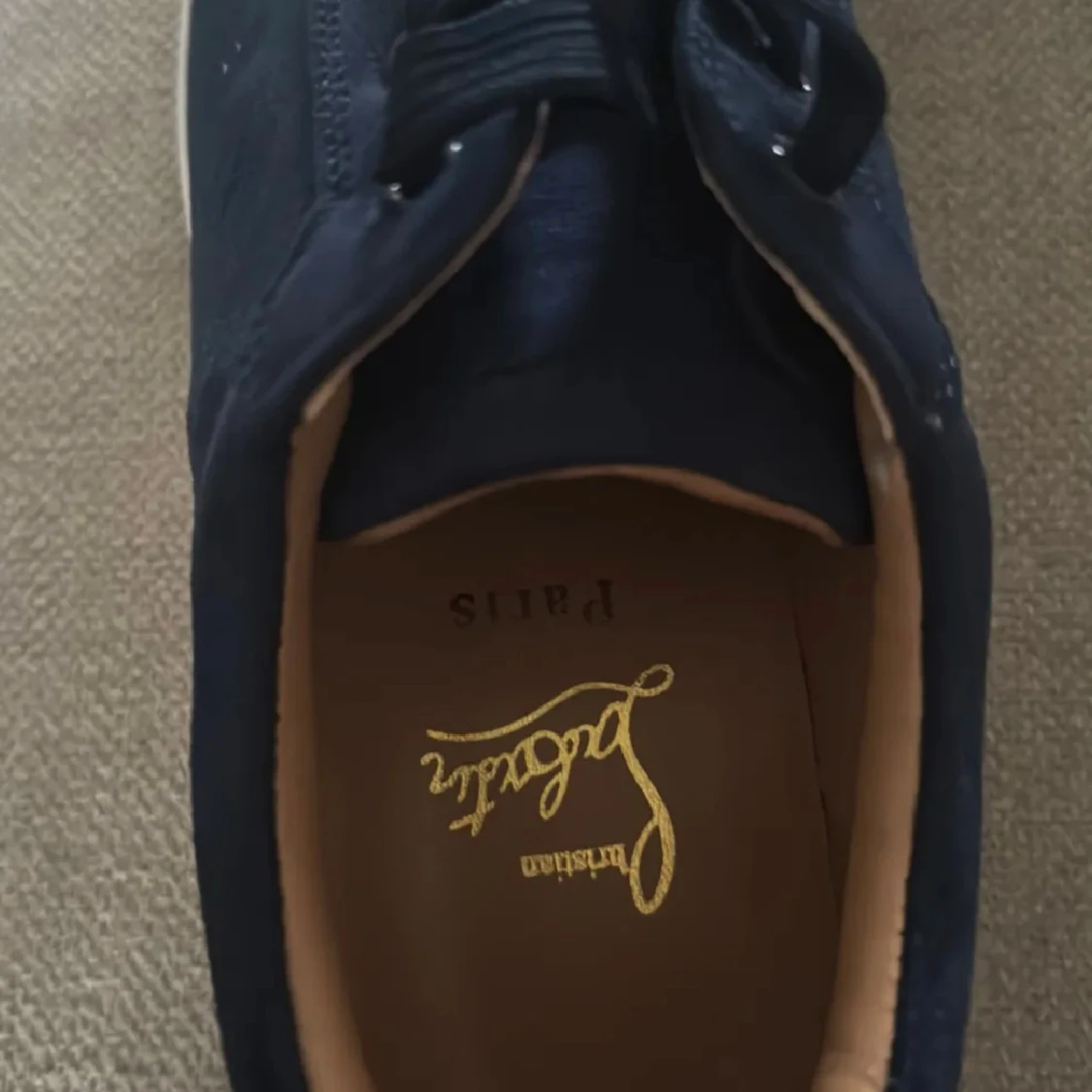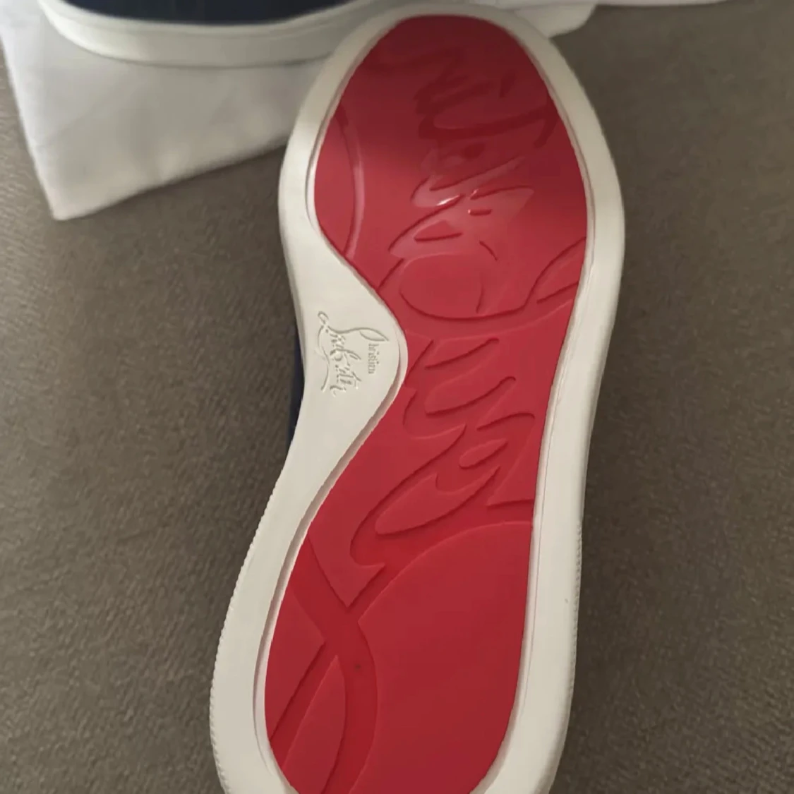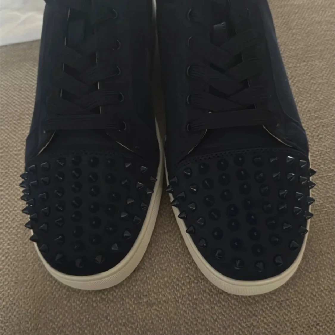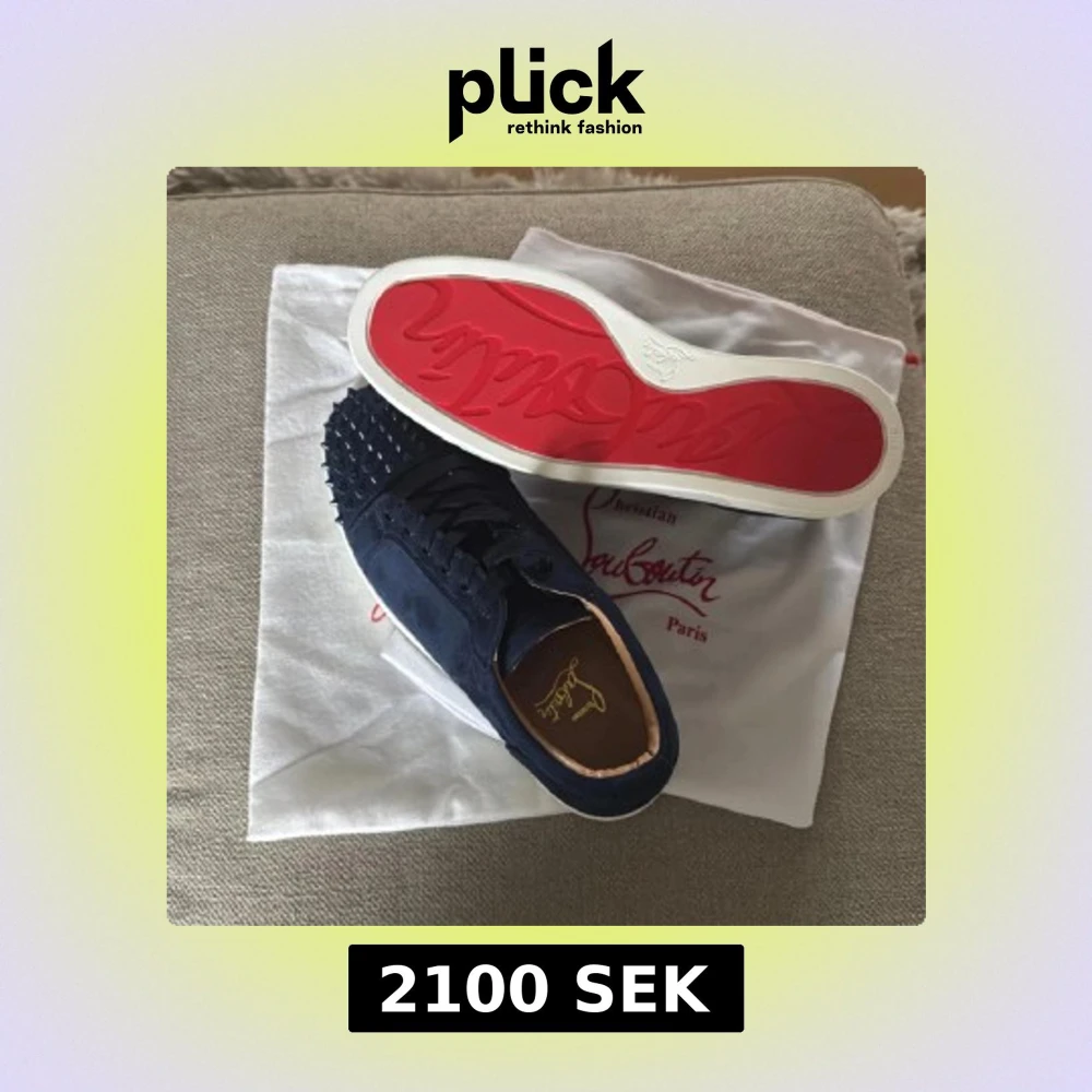 Säljer ett par mörkblå sneakers från Christian Louboutin med ikonisk röd sula och spetsiga nitar framtill. Storlek 44 köpte för 2500 men passade inte så säljer de helt nya