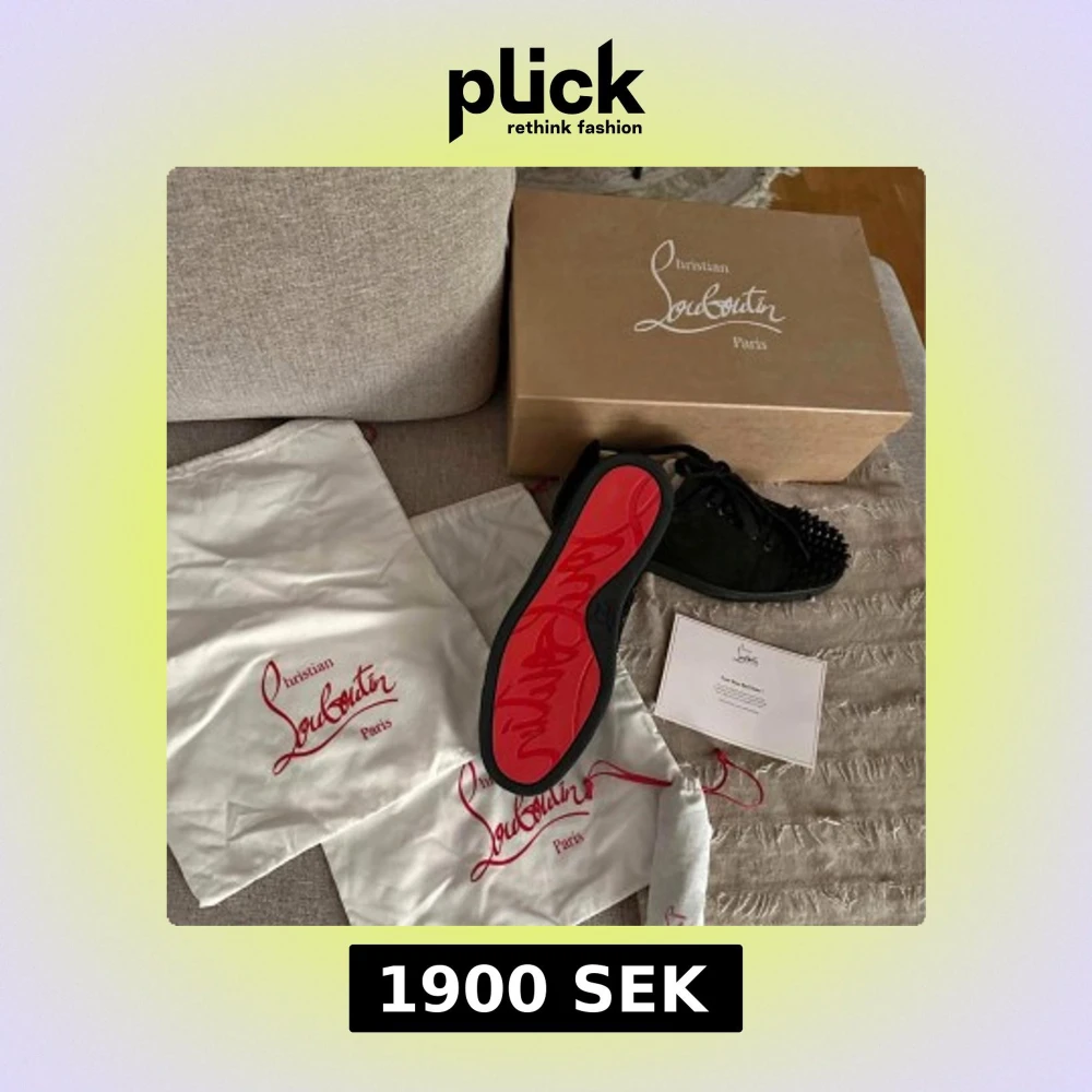Snygga svarta sneakers från Christian Louboutin med ikoniska röda sulor och coola nitar på ovansidan. Skorna har snörning och kommer med originalförpackning och dustbags. Perfekta för att ge din outfit en edgy touch, aldrig använda endast tästade storlek 43!!