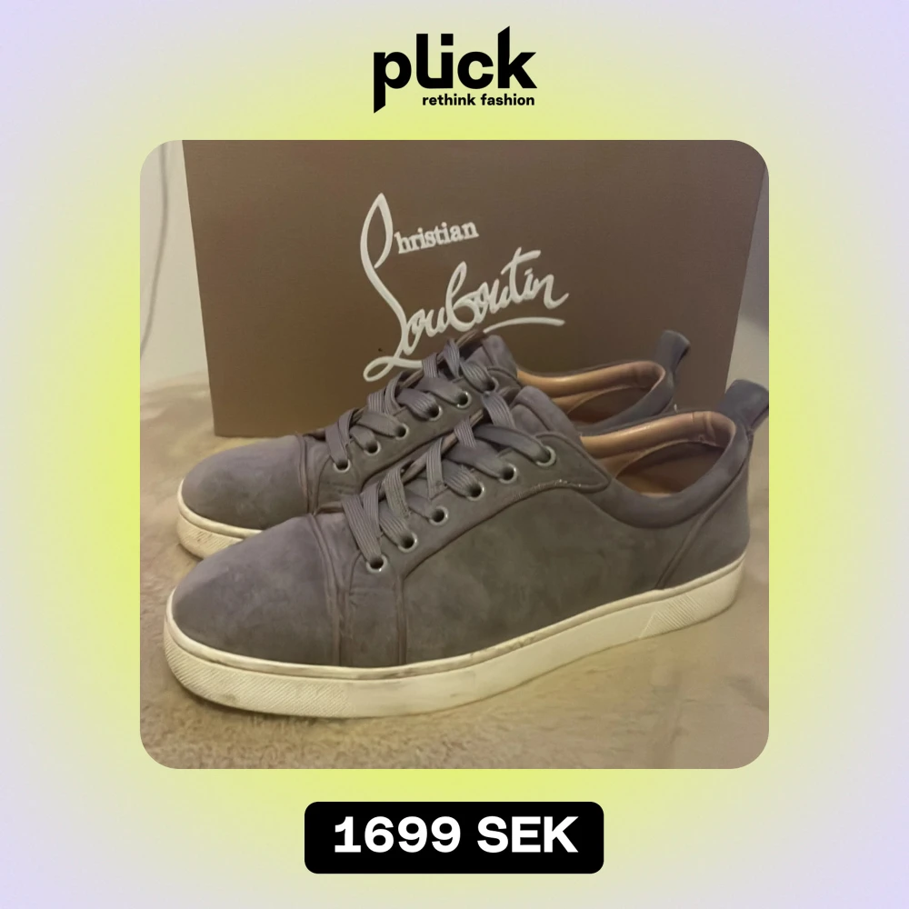 Snygga grå sneakers från Christian Louboutin i mocka med den ikoniska röda sulan. Skorna har snörning och en stilren design. Skorna är i storlek 39. Kartong och påse ingår, tyvärr har jag ej kvittot kvar.