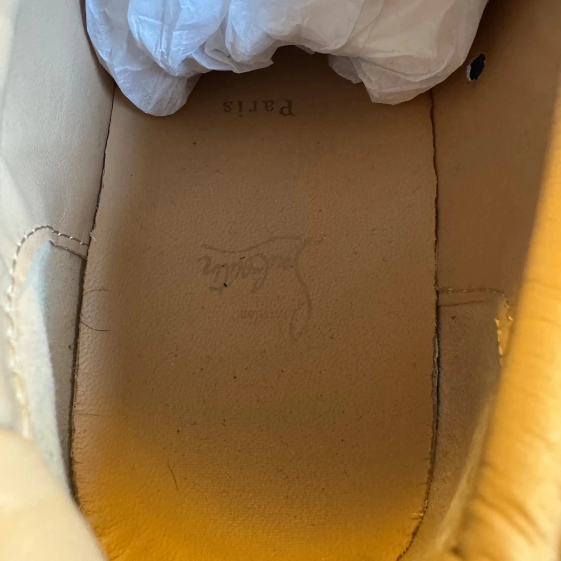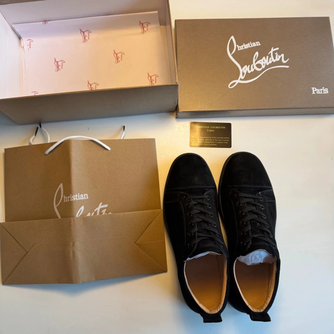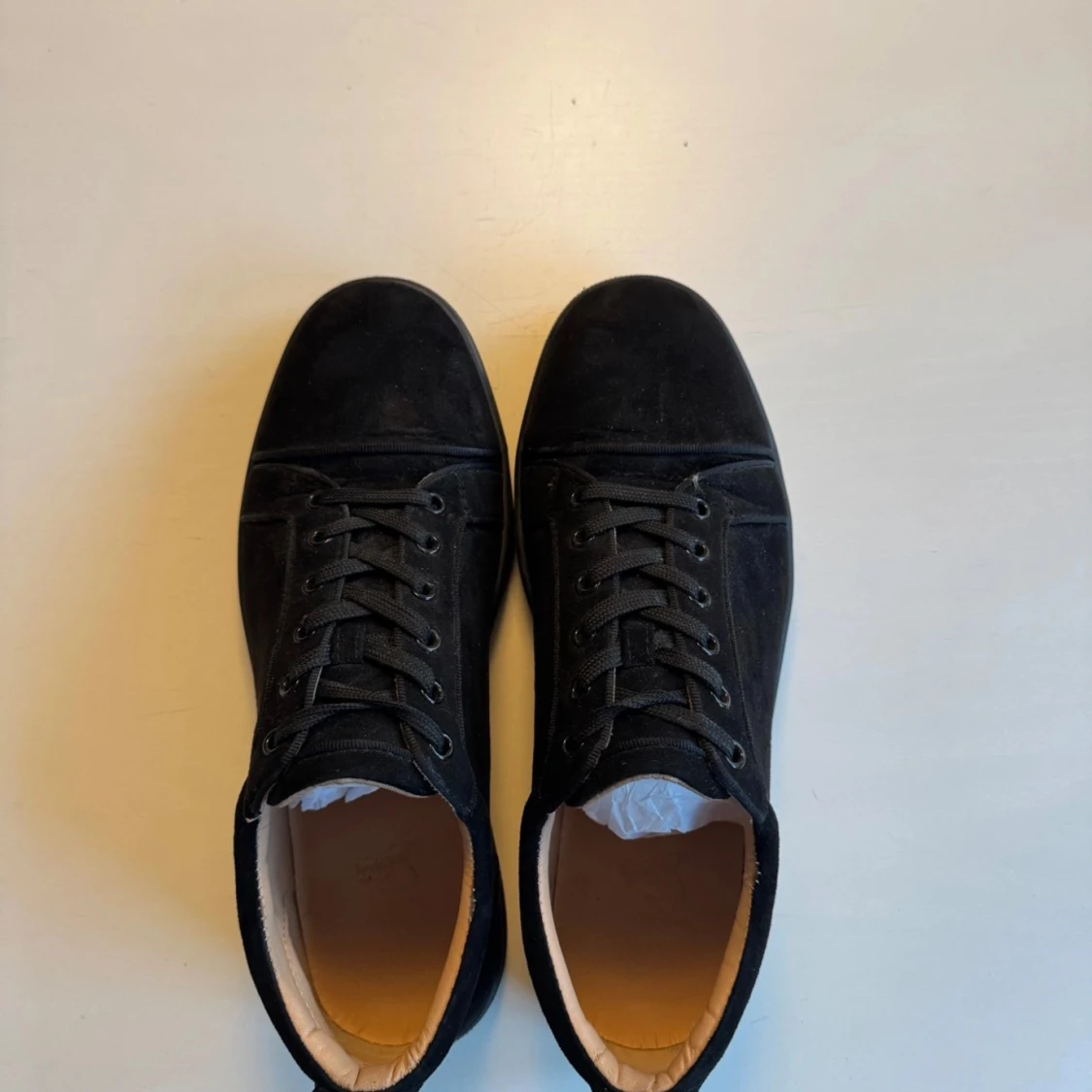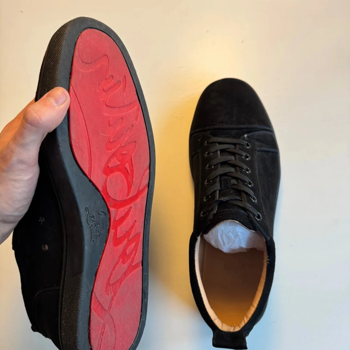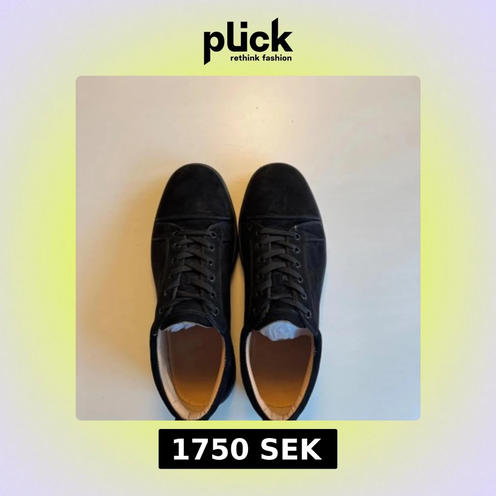 Snygga svarta sneakers från Christian Louboutin med den ikoniska röda sulan i storlek 43. Skorna har snörning och är tillverkade i mocka, vilket ger en lyxig känsla. Perfekta för att ge din outfit en exklusiv touch. Allt og tillkommer.OBS priset är inte satt i sten och kan diskuteras vid snabb affär. Hör gärna av er vid frågor!😉
