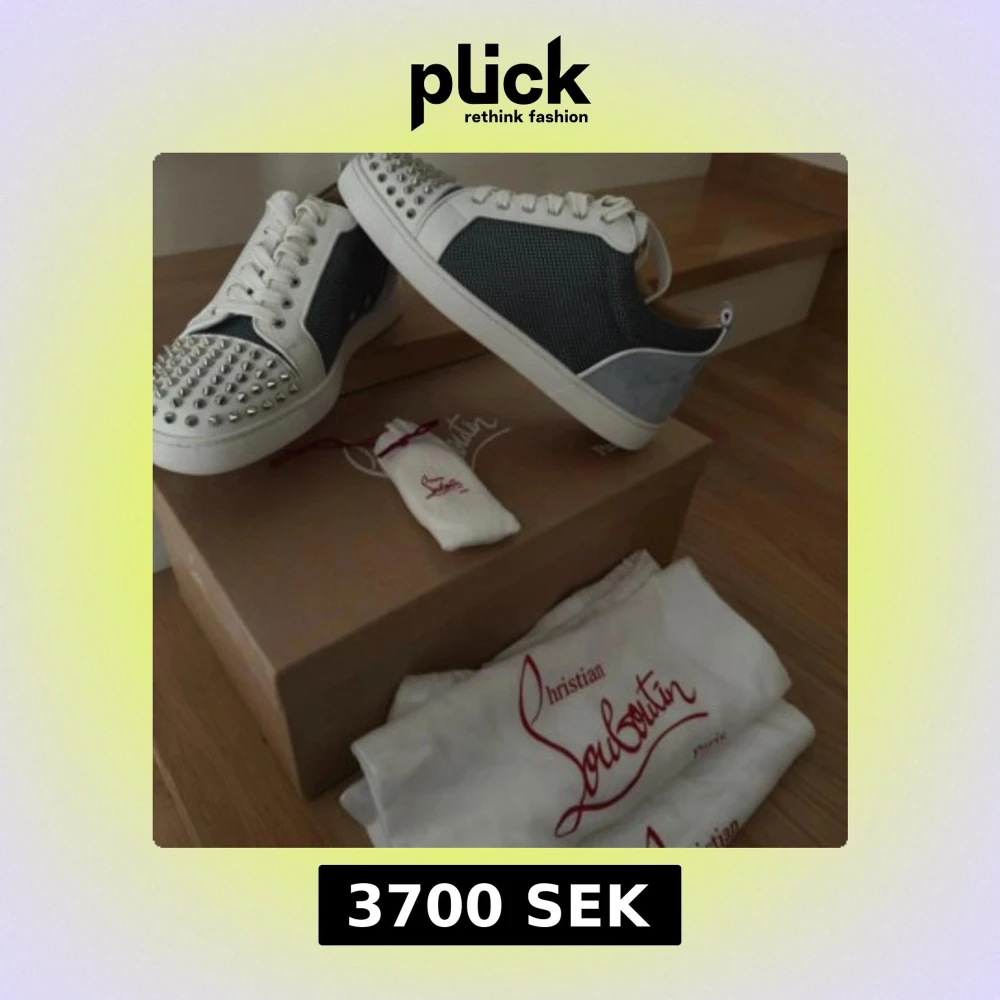 Snygga sneakers från Christian Louboutin i vitt och grått med silverfärgade nitar på tån, röda sulor och detaljer i skinn och mocka. Storlek 43,5 men passar mer som 44. Skorna har snörning och en cool, edgy vibe som sticker ut. Perfekta för dig som vill ha något unikt och lyxigt i garderoben. 10/10 i skick, Knappast använda och kvitto medföljer. Tar gärna byten också sålänge de är rimliga