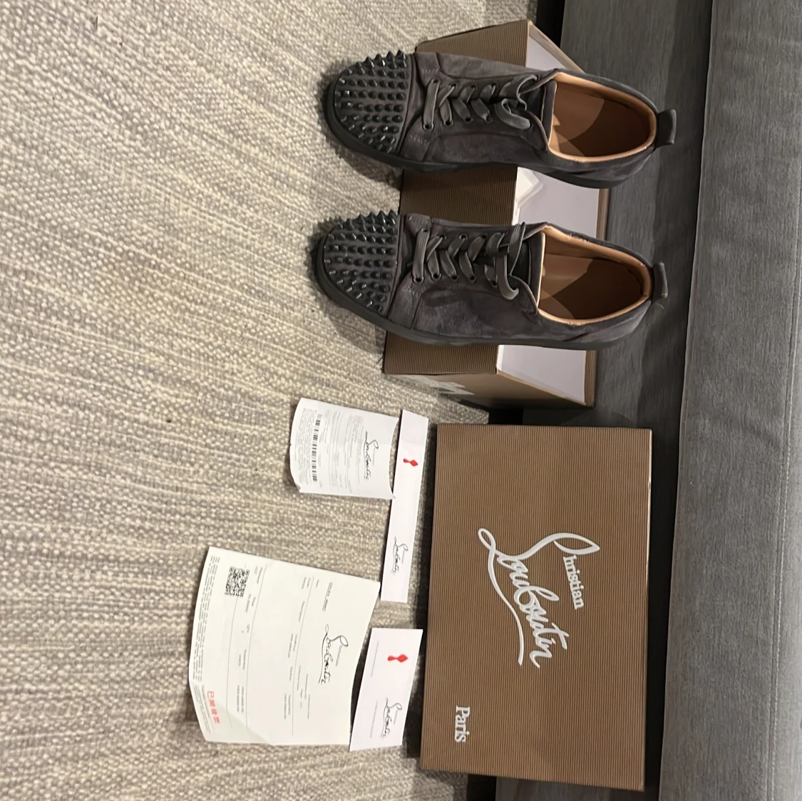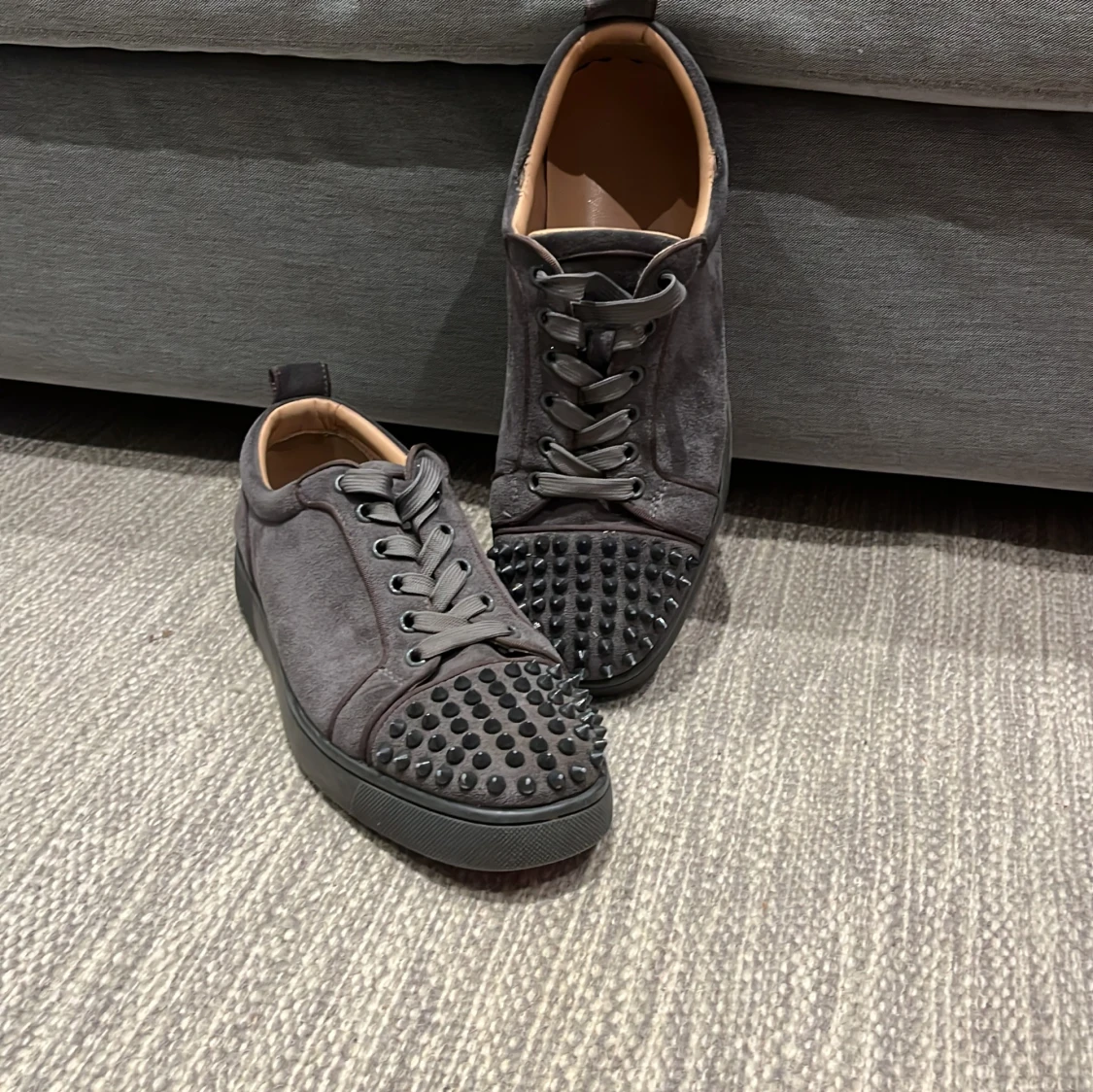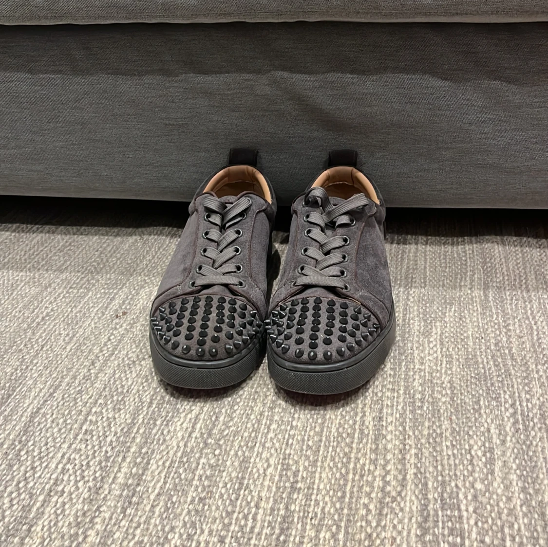 Säljer ett par gråa sneakers från Christian Louboutin med ikoniska röda sulor och svarta nitar på tån. Skorna är i mocka med snörning och har en cool, edgy vibe. Perfekta för dig som vill sticka ut med exklusiva detaljer och lyxig känsla.