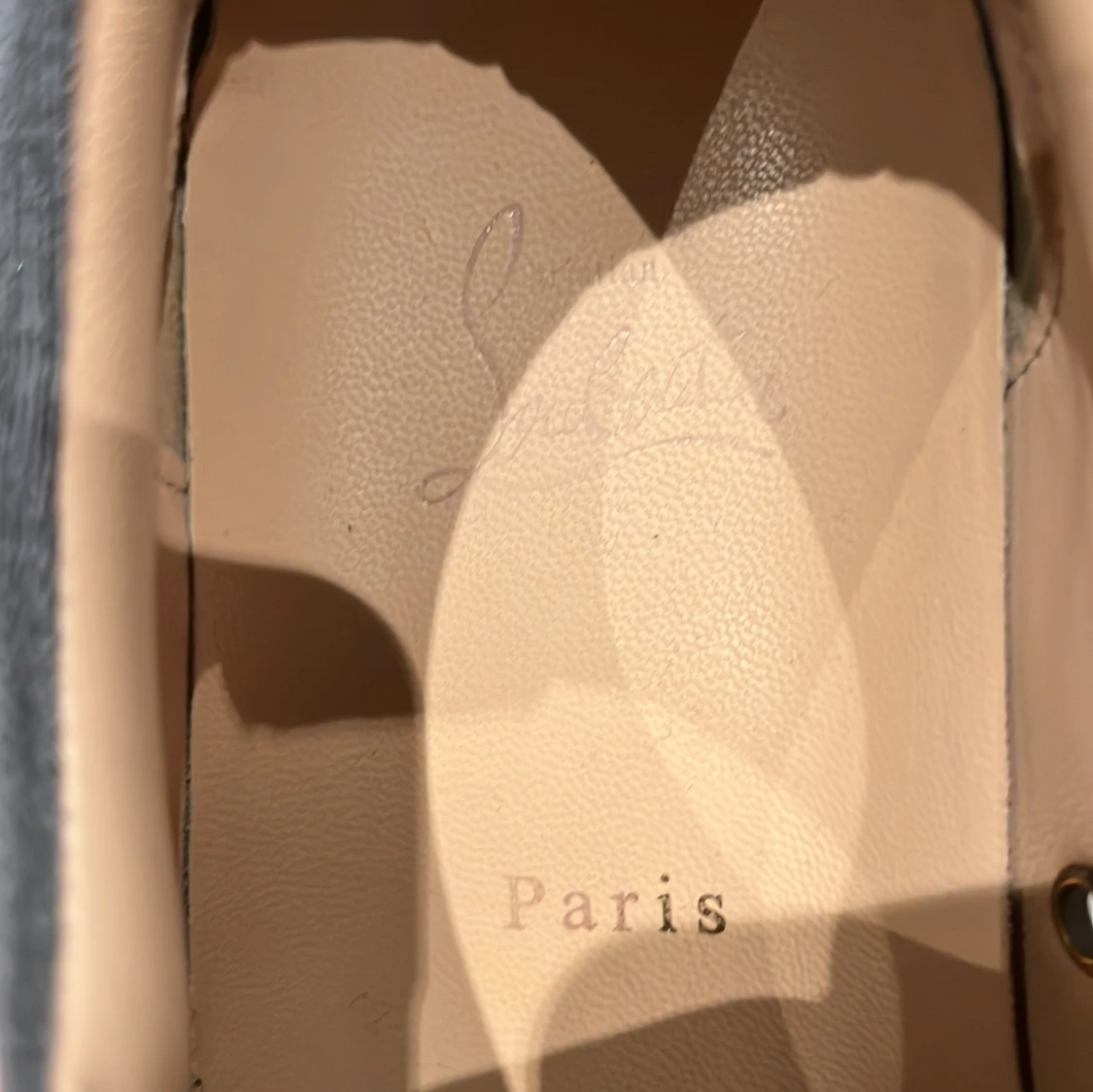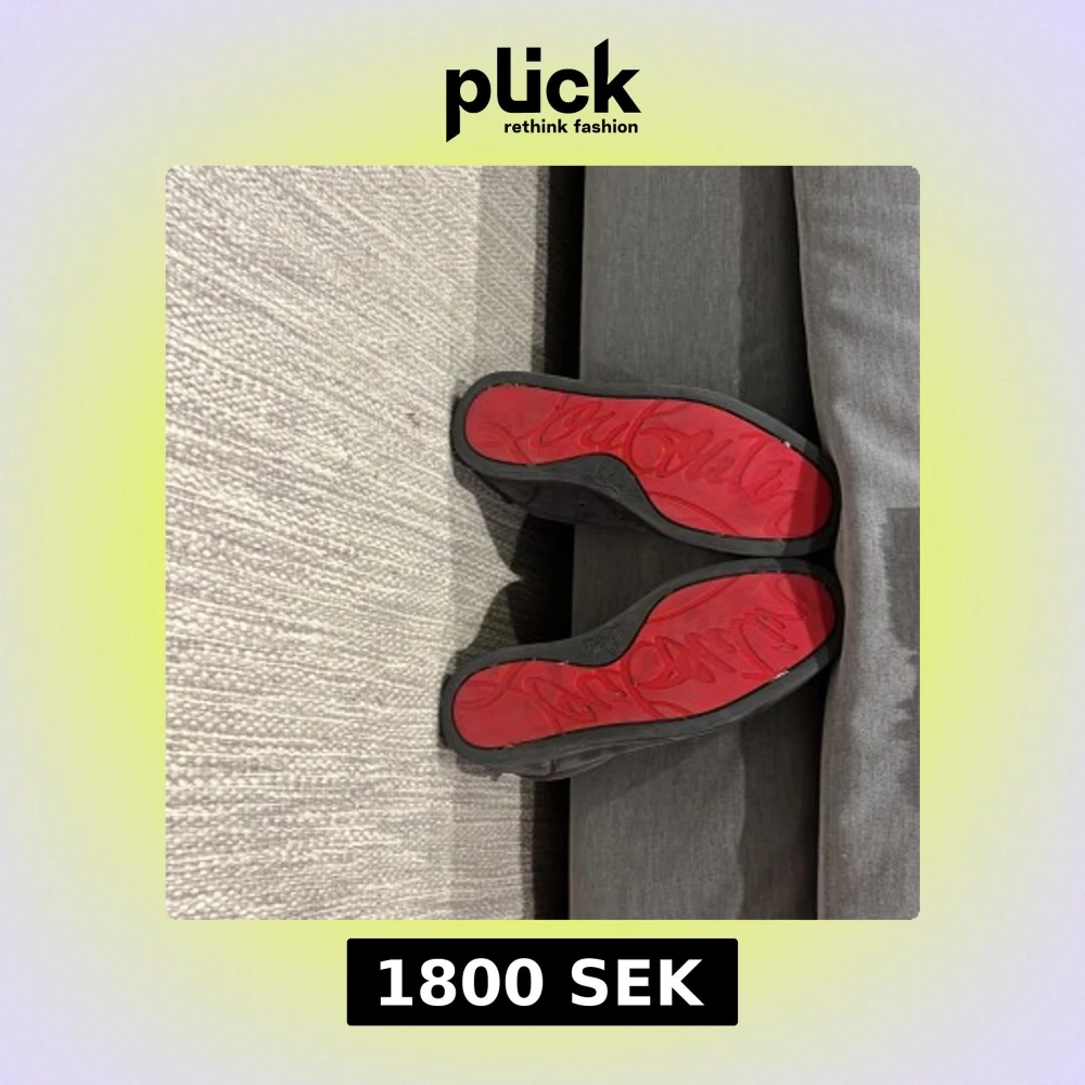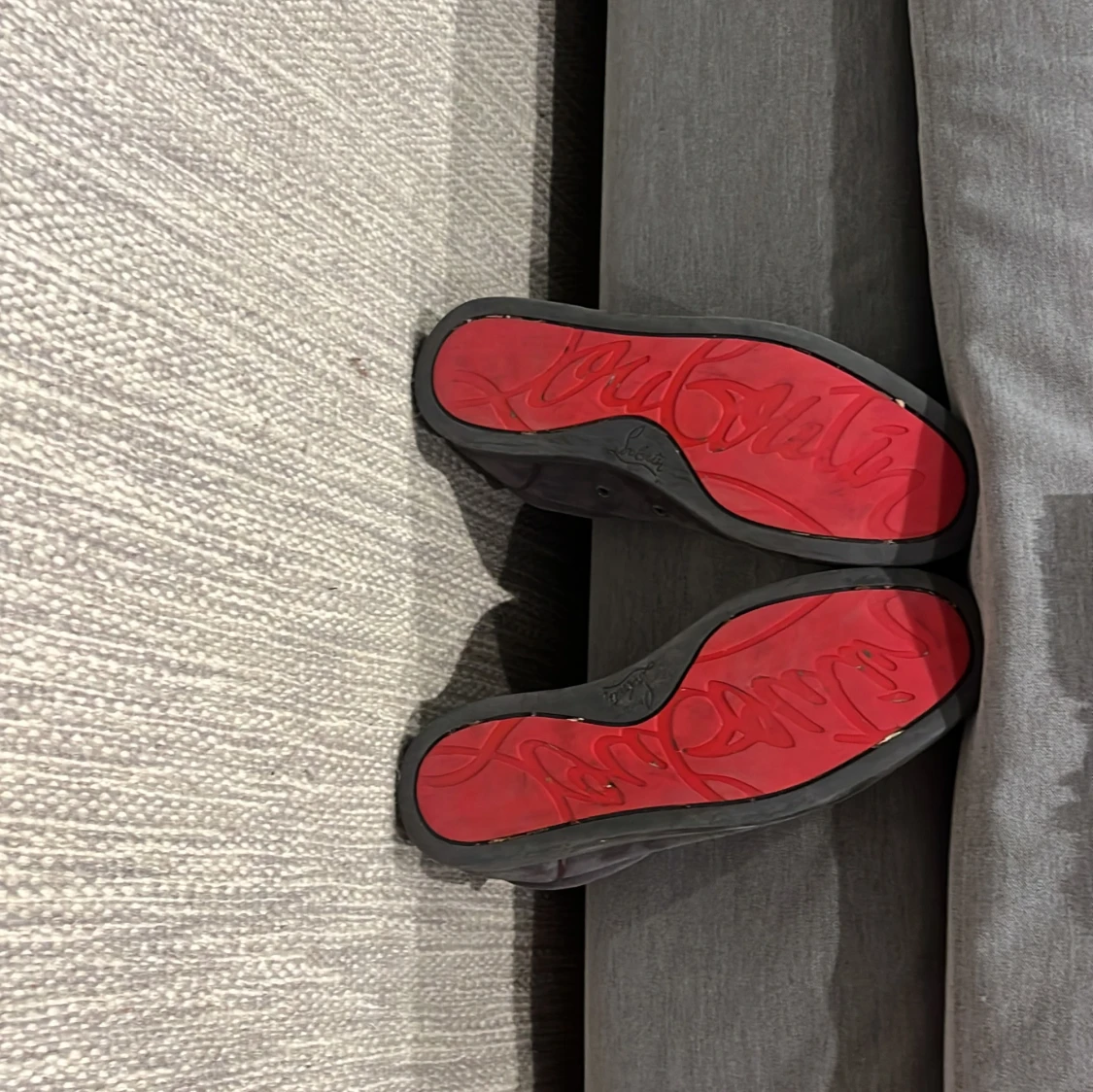 Säljer ett par gråa sneakers från Christian Louboutin med ikoniska röda sulor och svarta nitar på tån. Skorna är i mocka med snörning och har en cool, edgy vibe. Perfekta för dig som vill sticka ut med exklusiva detaljer och lyxig känsla.