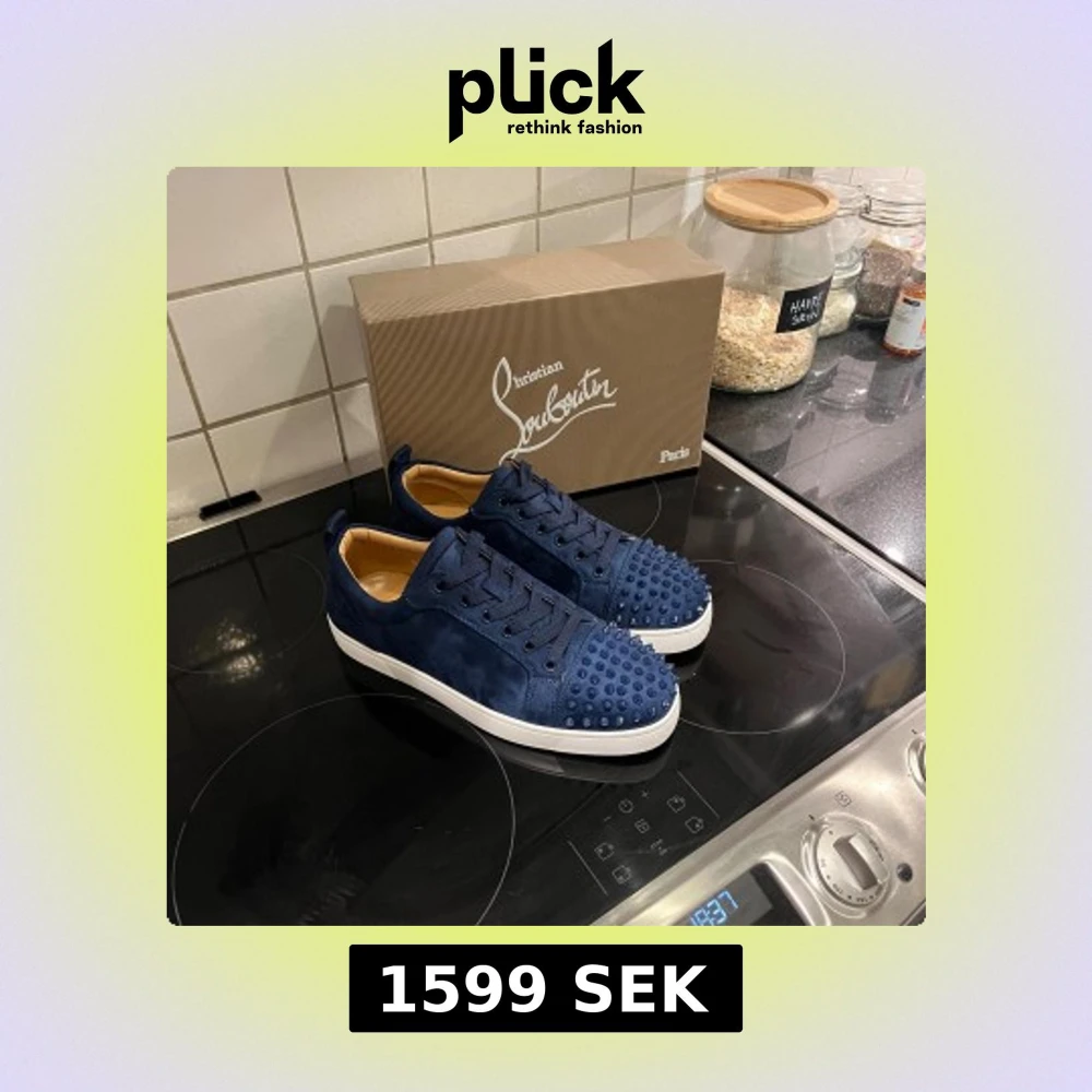 Snygga mörkblå sneakers från Christian Louboutin i mocka med coola nitar på tån och klassisk röd sula. Skorna har snörning och en rund tå, samt vit platt sula som ger en fräsch kontrast. Perfekta för dig som vill sticka ut med exklusiv stil.
