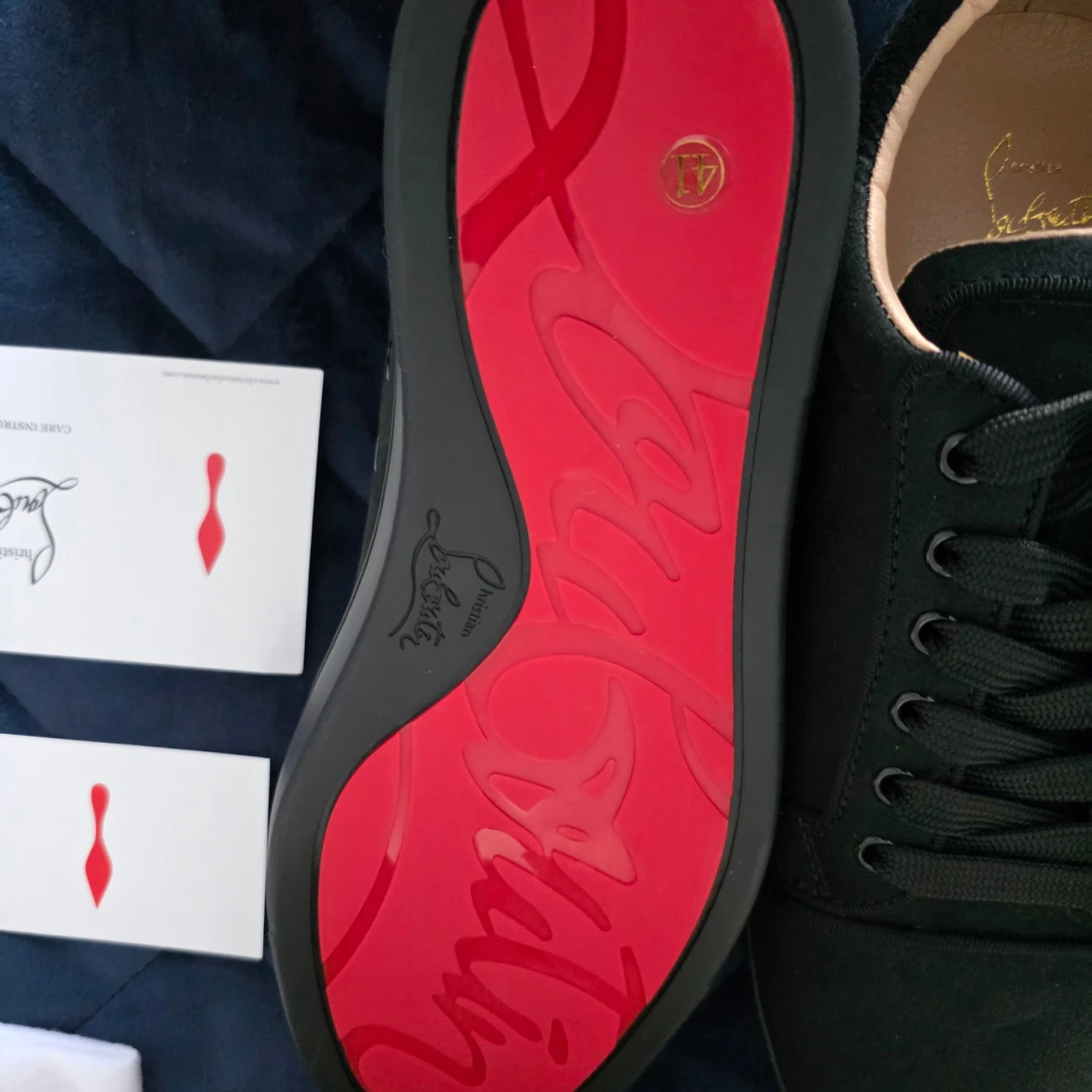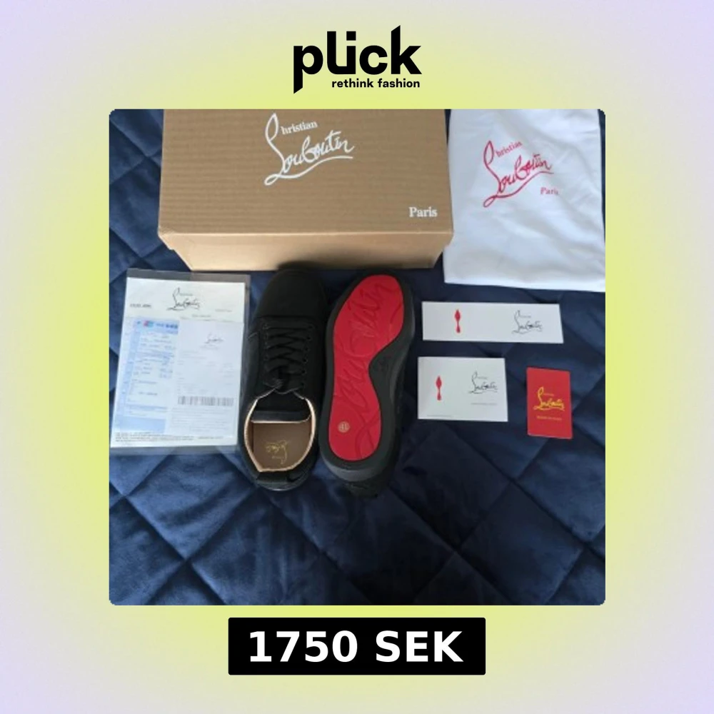Exklusiva svarta sneakers från Christian Louboutin med ikonisk röd sula och diskret logga på innersulan. Skorna har snörning, rund tå och är tillverkade i skinn med detaljer i svart textil. Kommer med originalkartong, dustbag och äkthetskort.