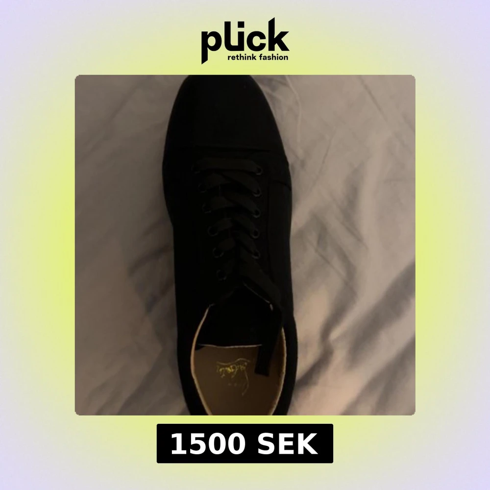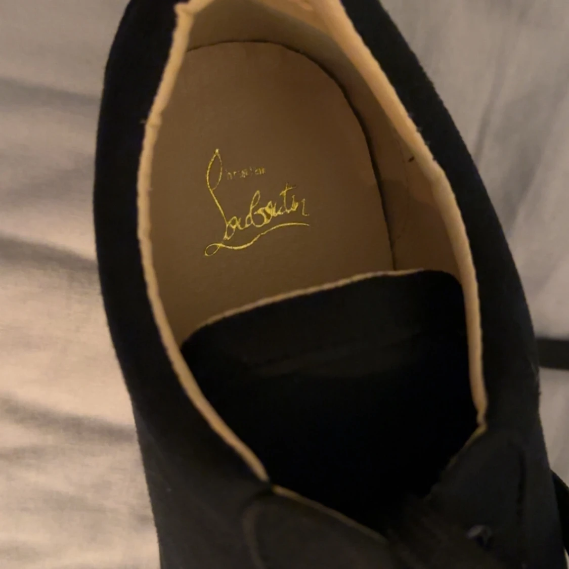 Säljer ett par svarta sneakers från Christian Louboutin med klassisk röd sula och guldfärgad logga på innersulan. Skorna har snörning och är tillverkade i ett tygmaterial. Perfekt för dig som vill sticka ut med exklusiva detaljer och ikonisk design.