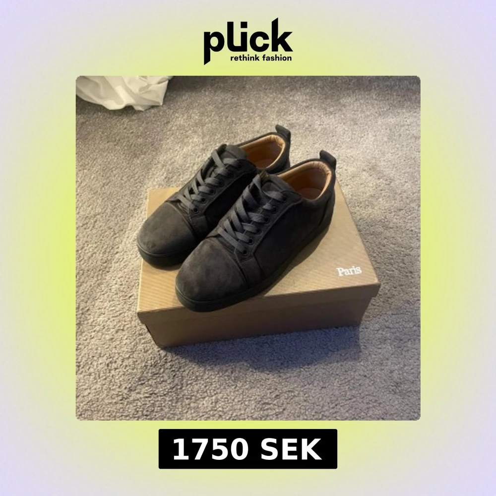 Snygga gråa sneakers från Christian Louboutin i mocka med klassisk röd sula. Skorna har rund tå, svarta skosnören och beige innersida i skinn. Perfekta för dig som vill ha en lyxig och stilren look med en ikonisk touch.