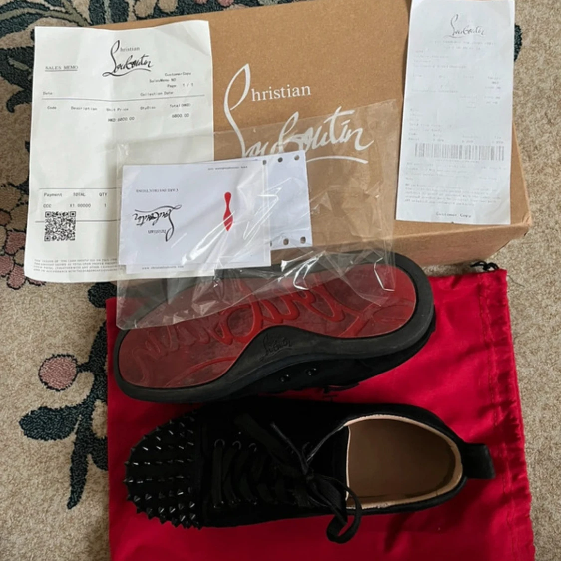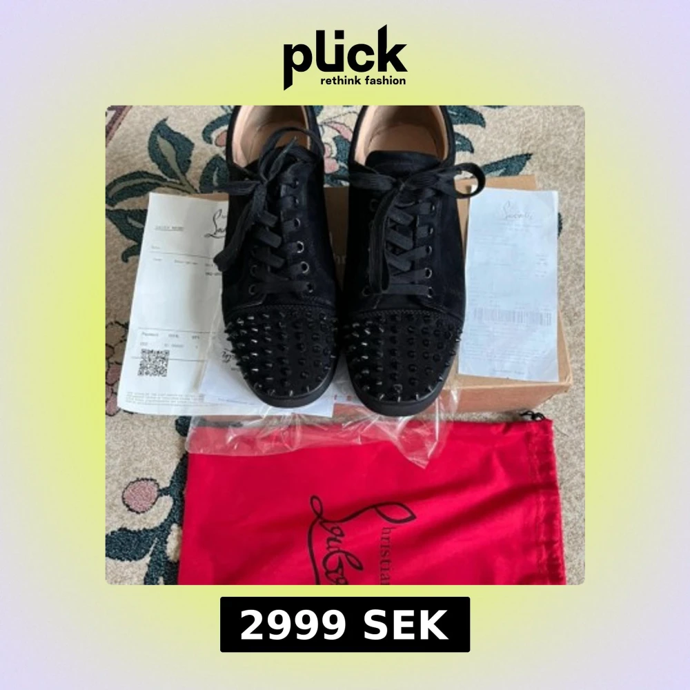 Svarta sneakers från Christian Louboutin i mocka med ikoniska röda sulor och svarta nitar på tån. Skorna har snörning och rund tå, samt en platt sula. Snygg och edgy design som sticker ut. Levereras med originalkartong och röd dustbag.