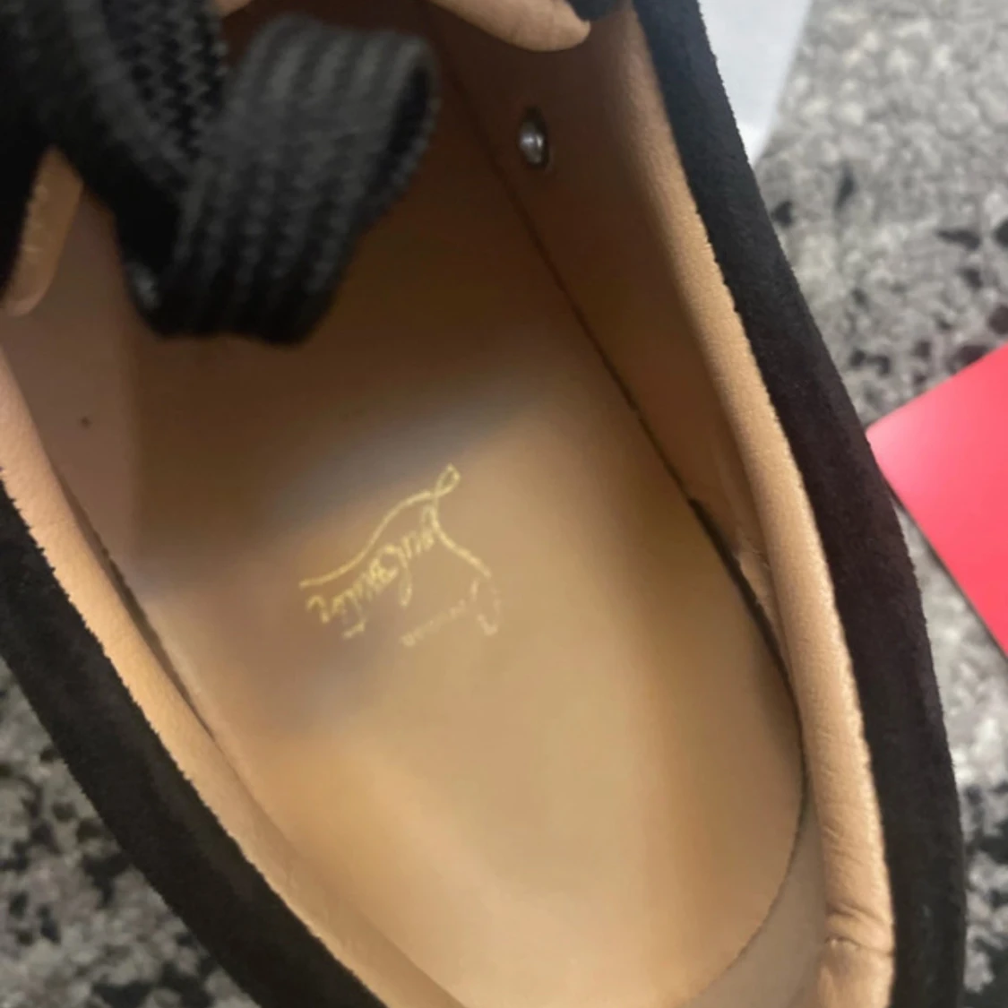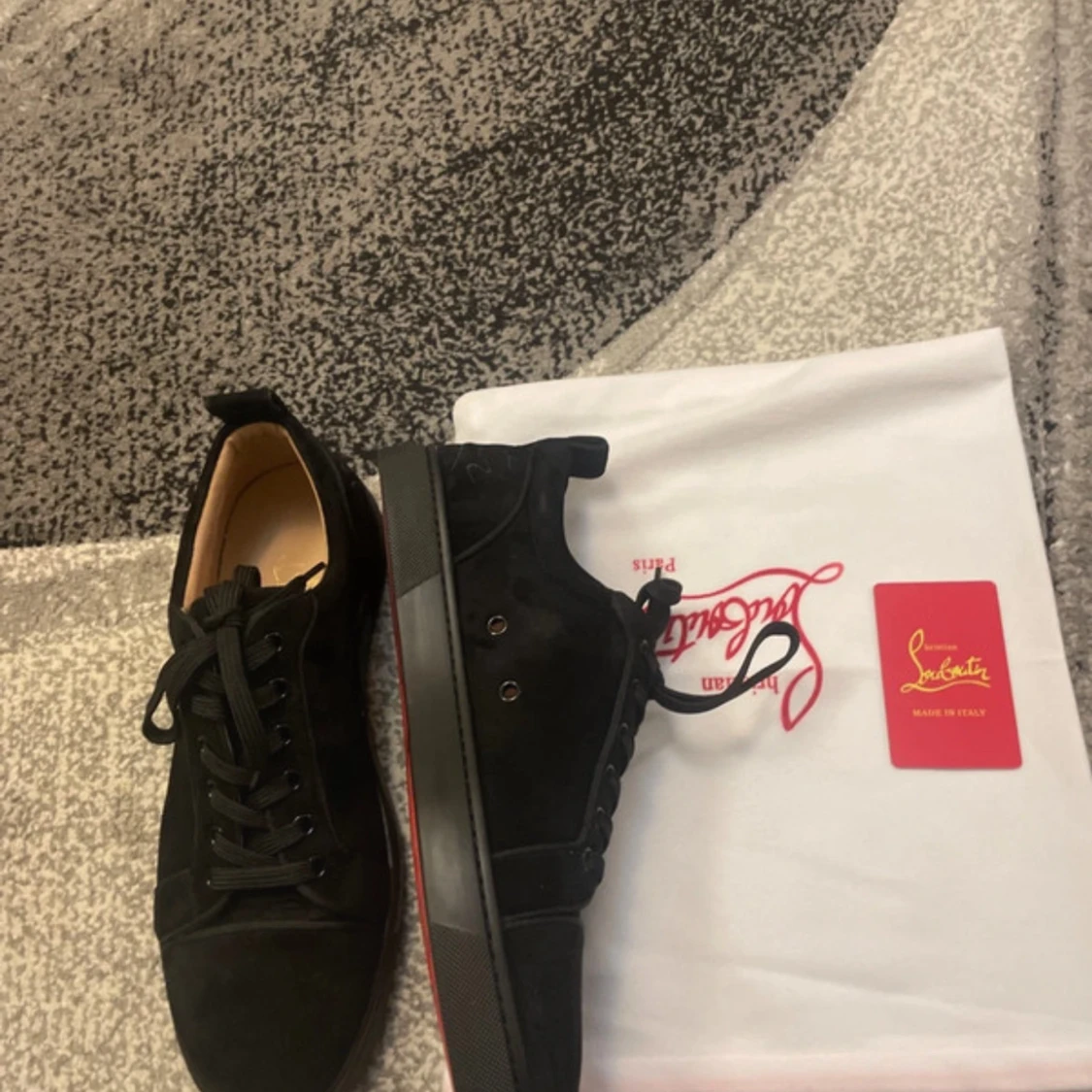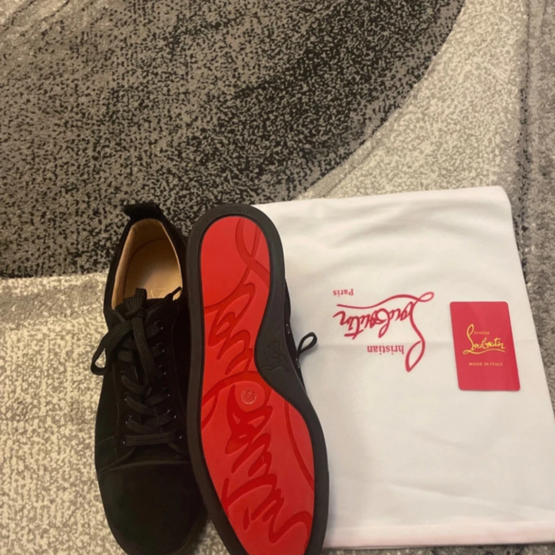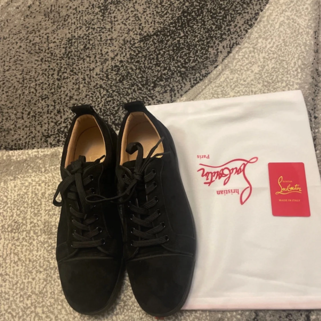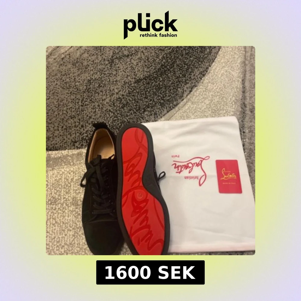 Snygga svarta sneakers från Christian Louboutin i mocka med klassisk röd sula och svarta snören. Skorna har rund tå och platt sula, perfekt för dig som vill ha en lyxig och stilren look. Kommer med dustbag och äkthetskort.