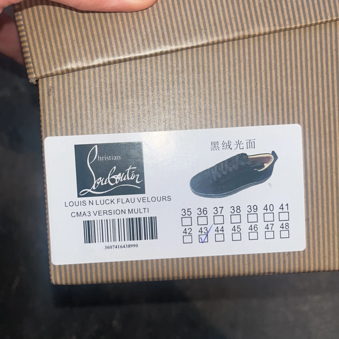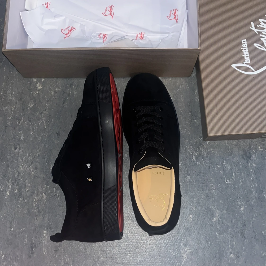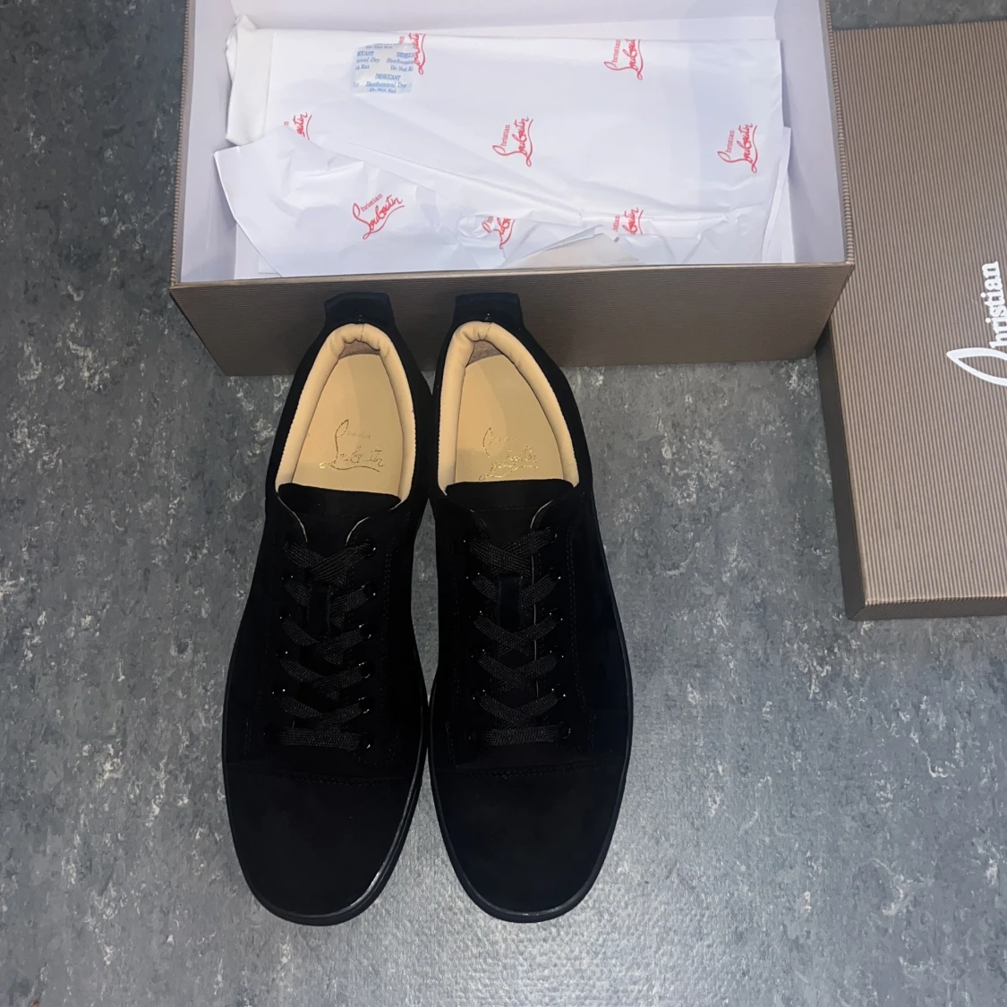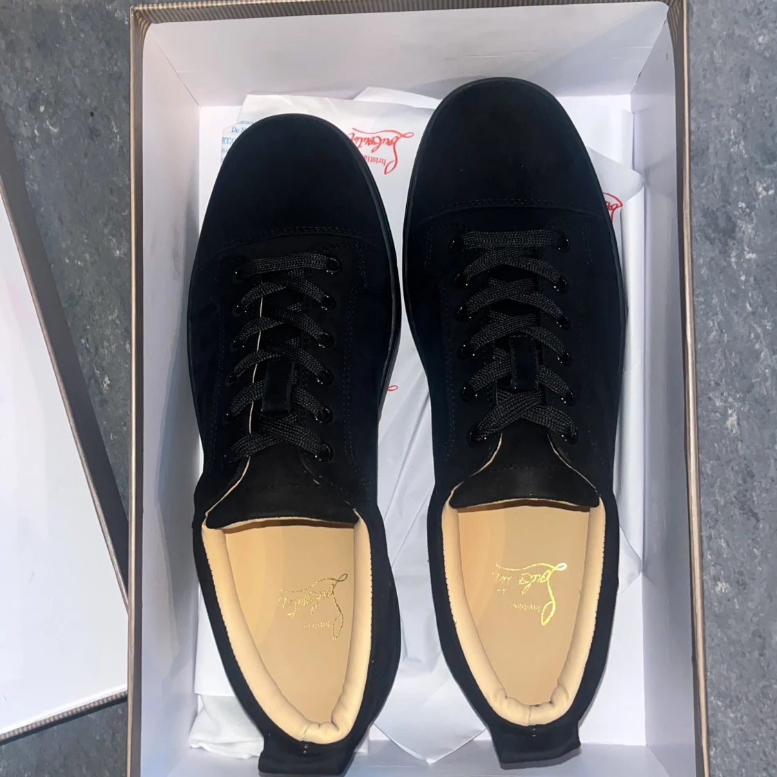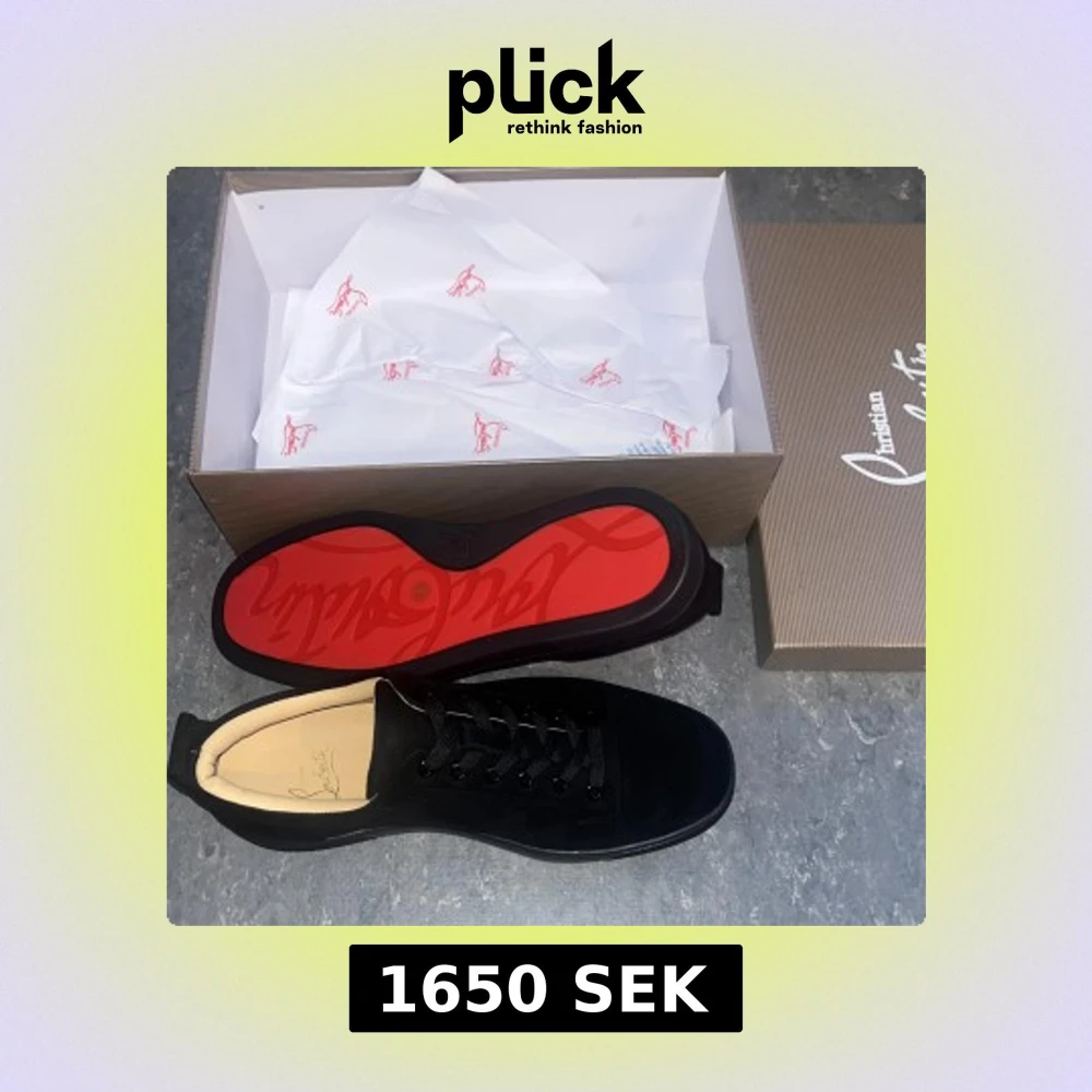 Säljer ett par svarta sneakers från Christian Louboutin i mocka med klassisk röd sula och svarta skosnören. Modellen heter Louis N Luck Flau Velours och har en stilren, rund tå och diskreta detaljer. Perfekta för dig som vill ha en lyxig och clean look. Storlek 43 säljer pga för stora för mig aldrig använt