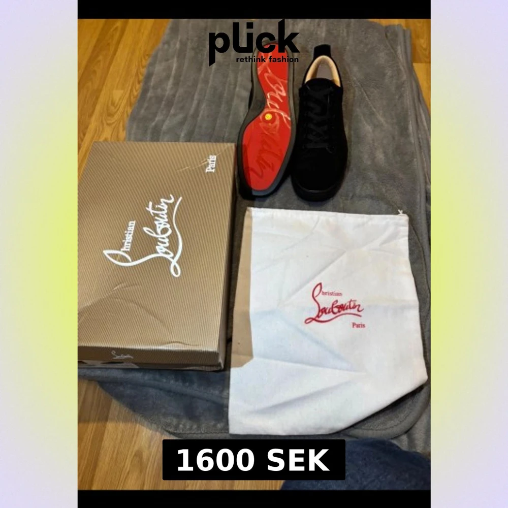 Svarta sneakers från Christian Louboutin med klassisk röd sula och guldfärgad logga på innersulan. Skorna har rund tå, snörning och är tillverkade i mocka med beige insida. Medföljer originalkartong och dustbag. Pris kan diskuteras vid ett snabbt köp