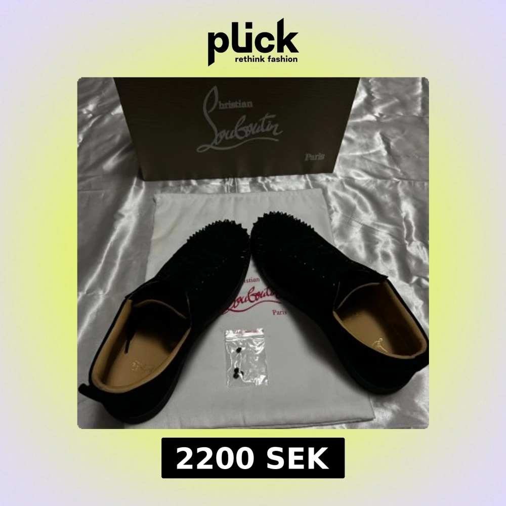 Svarta sneakers från Christian Louboutin i mocka med coola svarta nitar över hela tån och sidorna. Skorna har klassisk röd sula, snörning och en låg profil. Kommer med originalkartong och dustbag. Perfekta för dig som vill sticka ut med lyxig streetstyle.