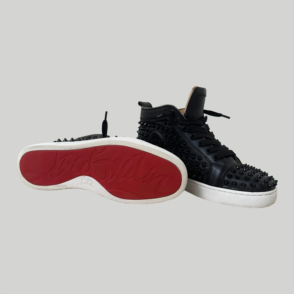 Svarta high-top sneakers i skinn från Christian Louboutin med ikoniska röda sulor och svarta nitar över hela skon. Klassisk snörning och vit platt sula ger en edgy och lyxig vibe. Perfekta för dig som vill sticka ut med din stil. Ny pris: 7000kr. Knappt använda och alla nitar är intakta. Säljer då dom inte passade. Priset är sänkt då sko lådan är slängd!🙏 fråga helst om mått och bilder innan du köper👍 skicka gärna bud😁🤞