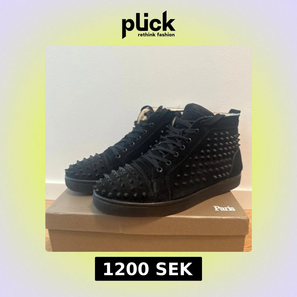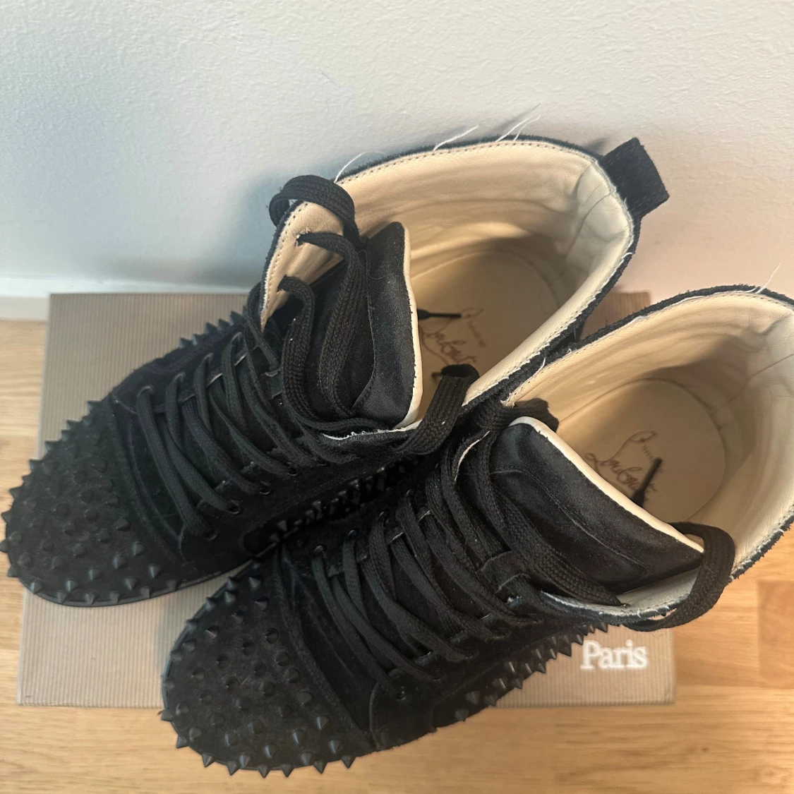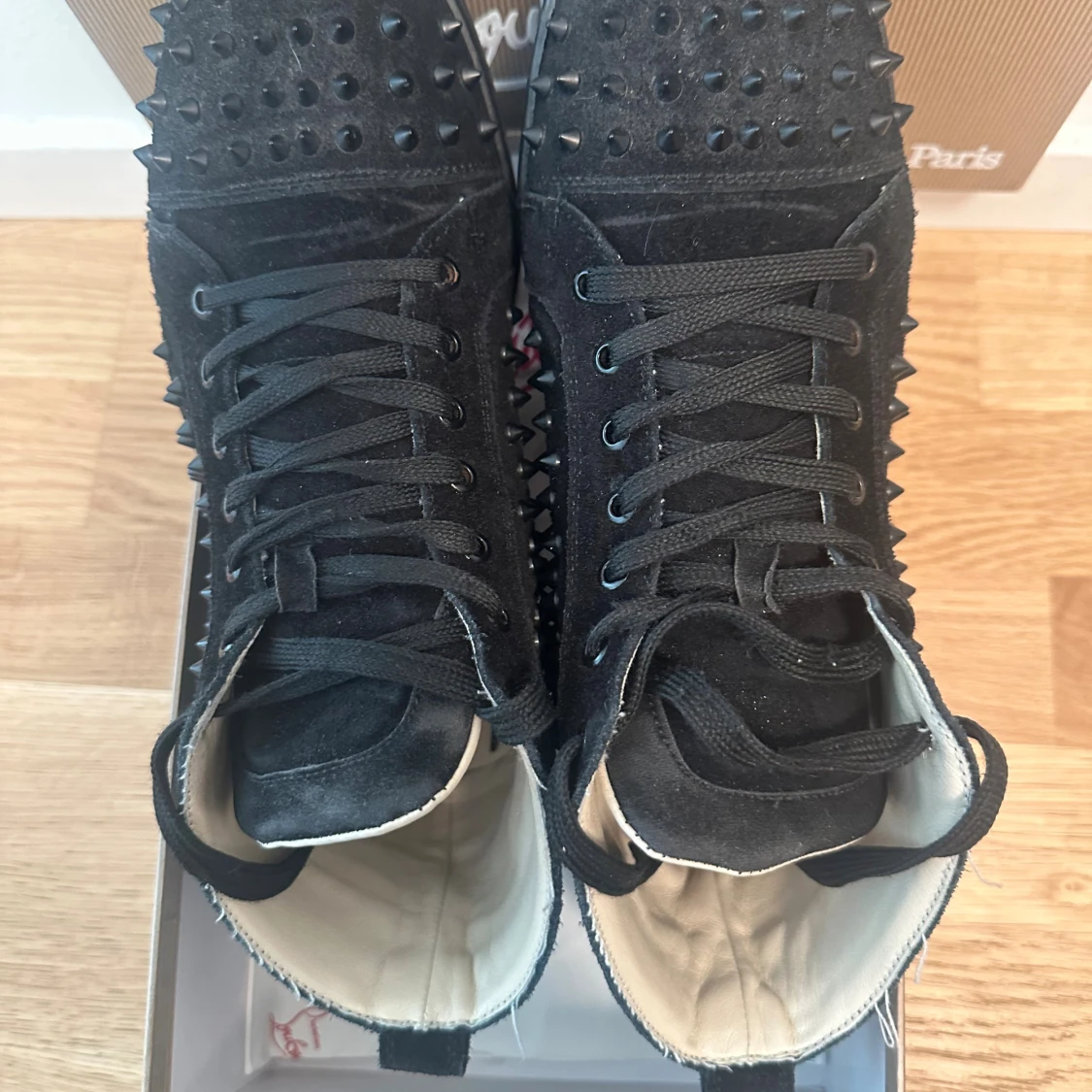 Svarta high-top sneakers från Christian Louboutin i mocka med svarta nitar över hela skon. Skorna har snörning, rund tå och svart platt sula. Insidan är ljus och mjukt vadderad för extra komfort. Riktigt edgy och sticker ut i mängden.