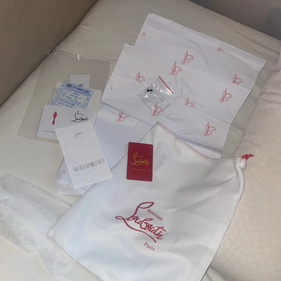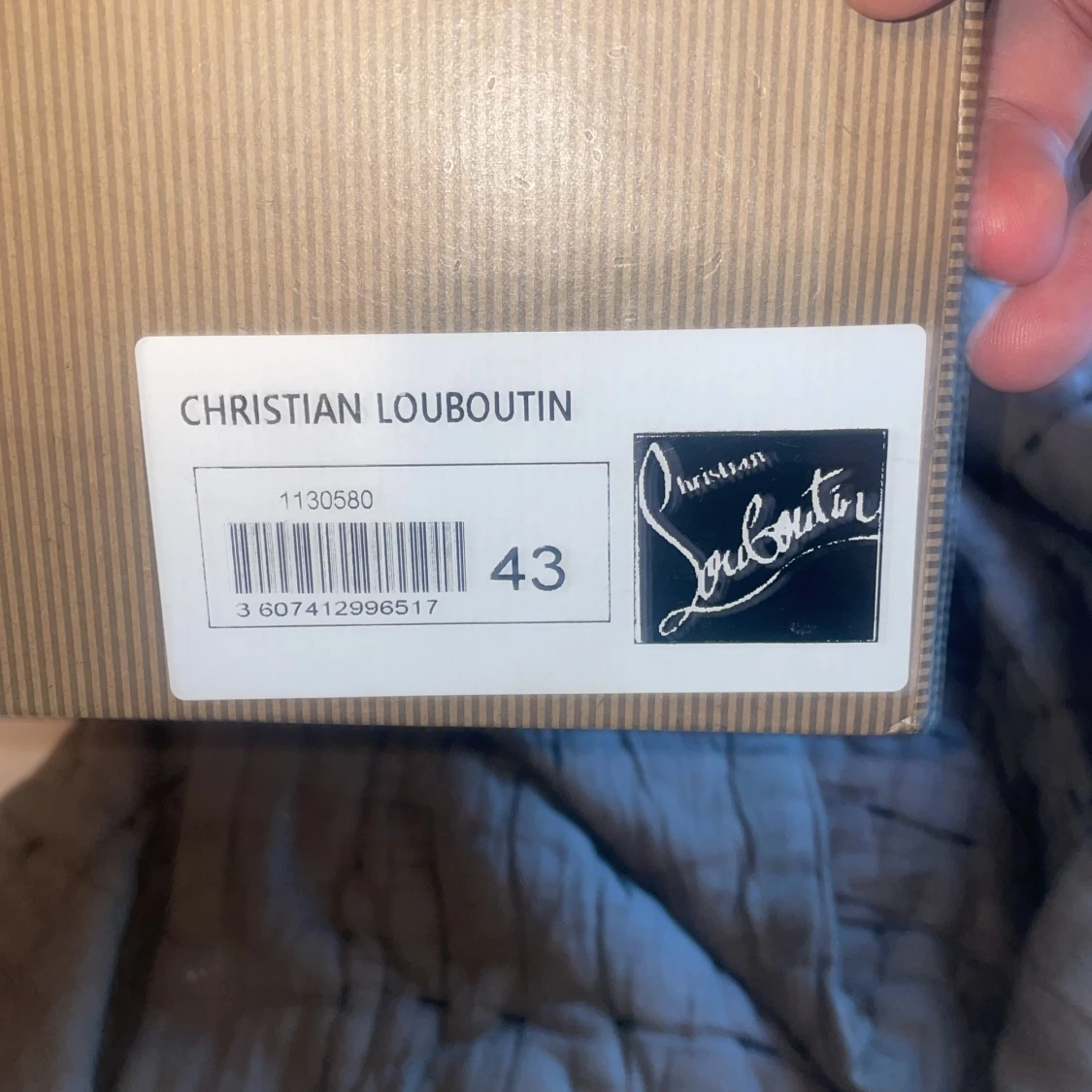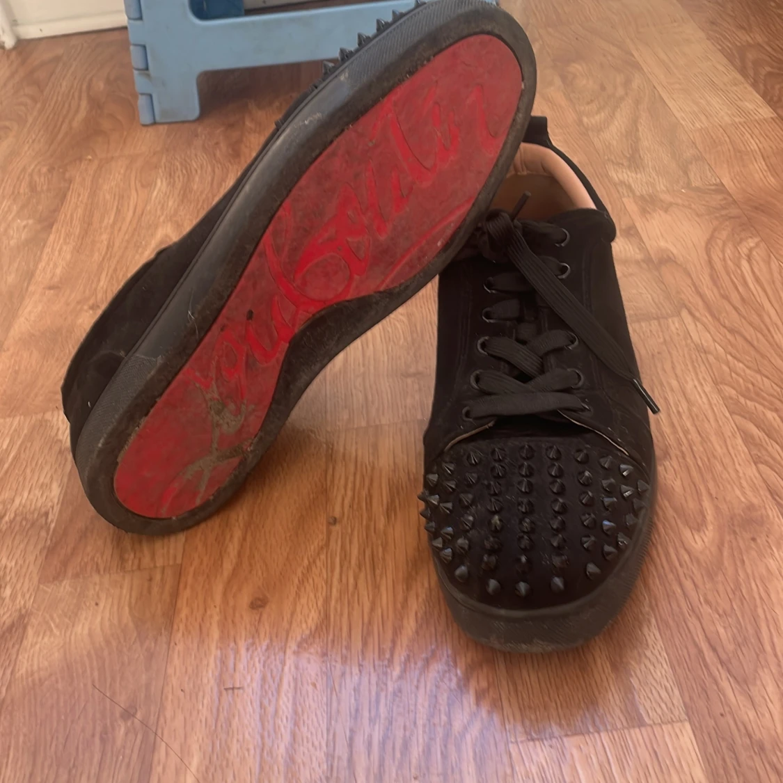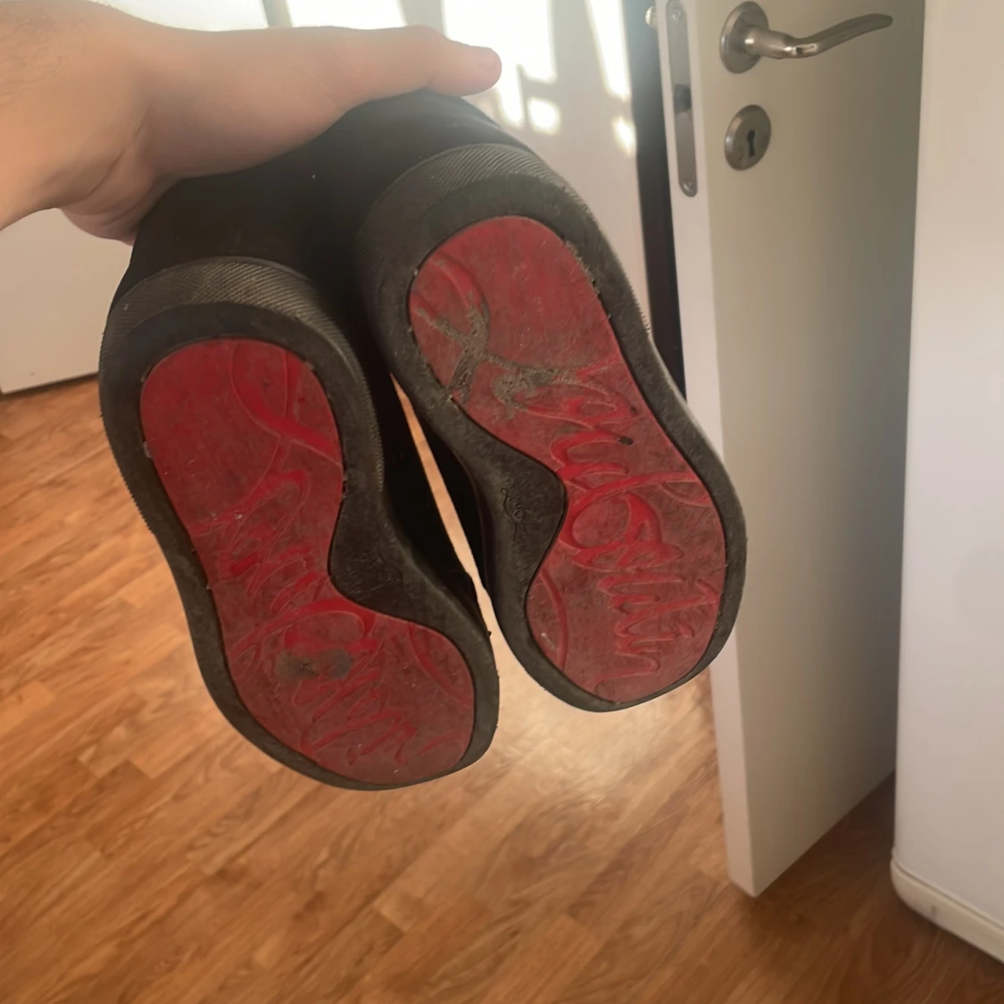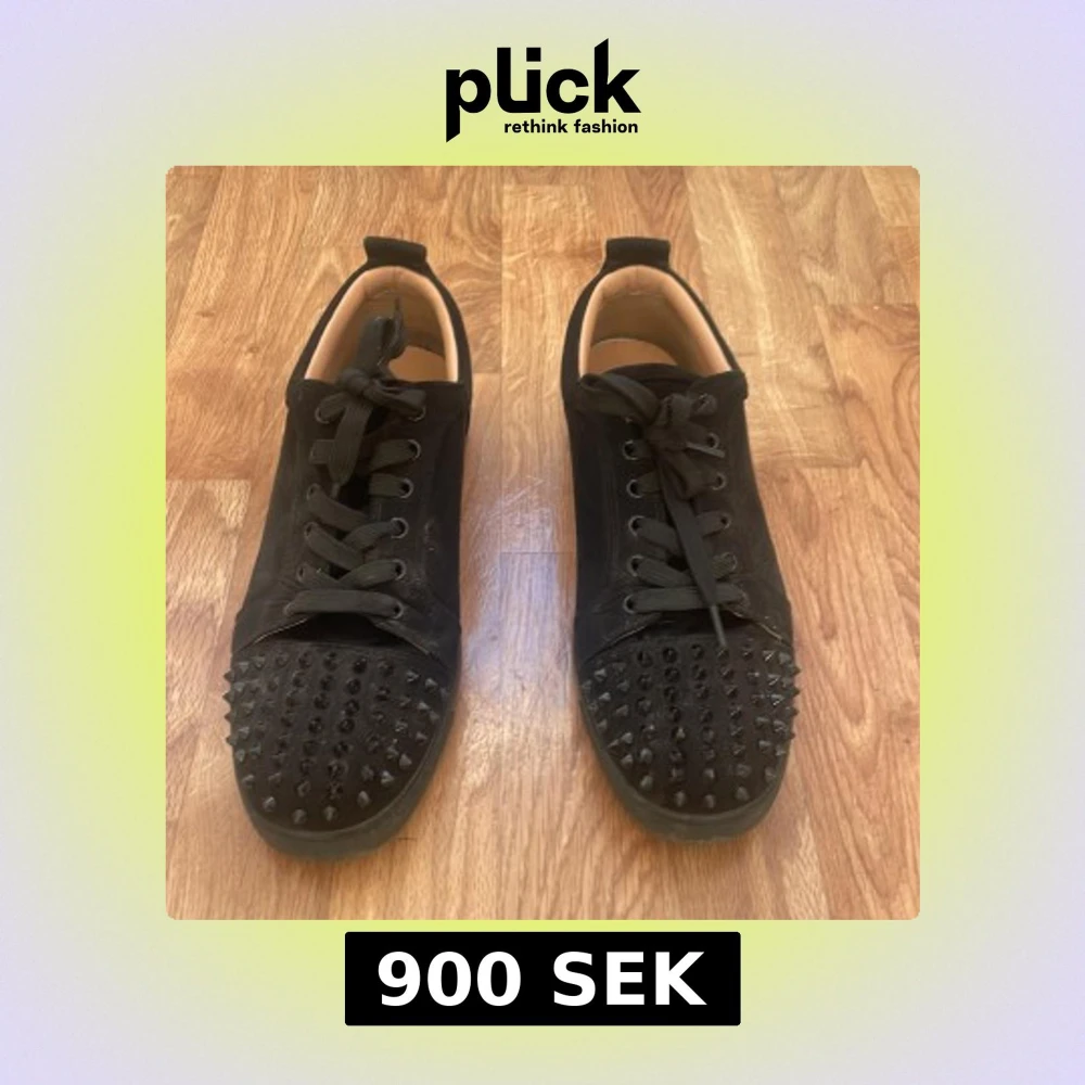 Svarta sneakers från Christian Louboutin i mocka med coola svarta nitar på tån och klassisk röd sula. Sparsamt använd och fortfarna i super skick behöver vara tvättas. Säljer på grund av att jag har ändrat still och har inte behov av de längre