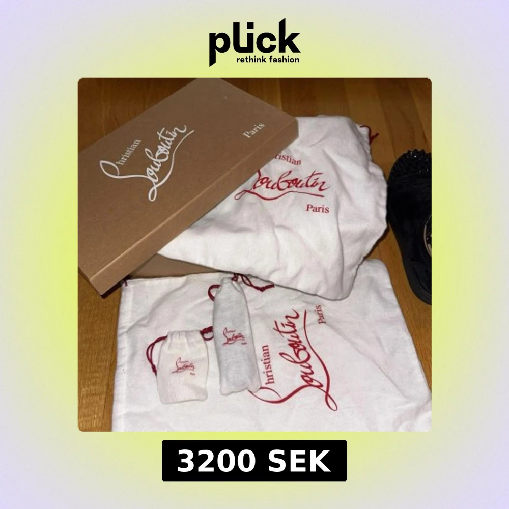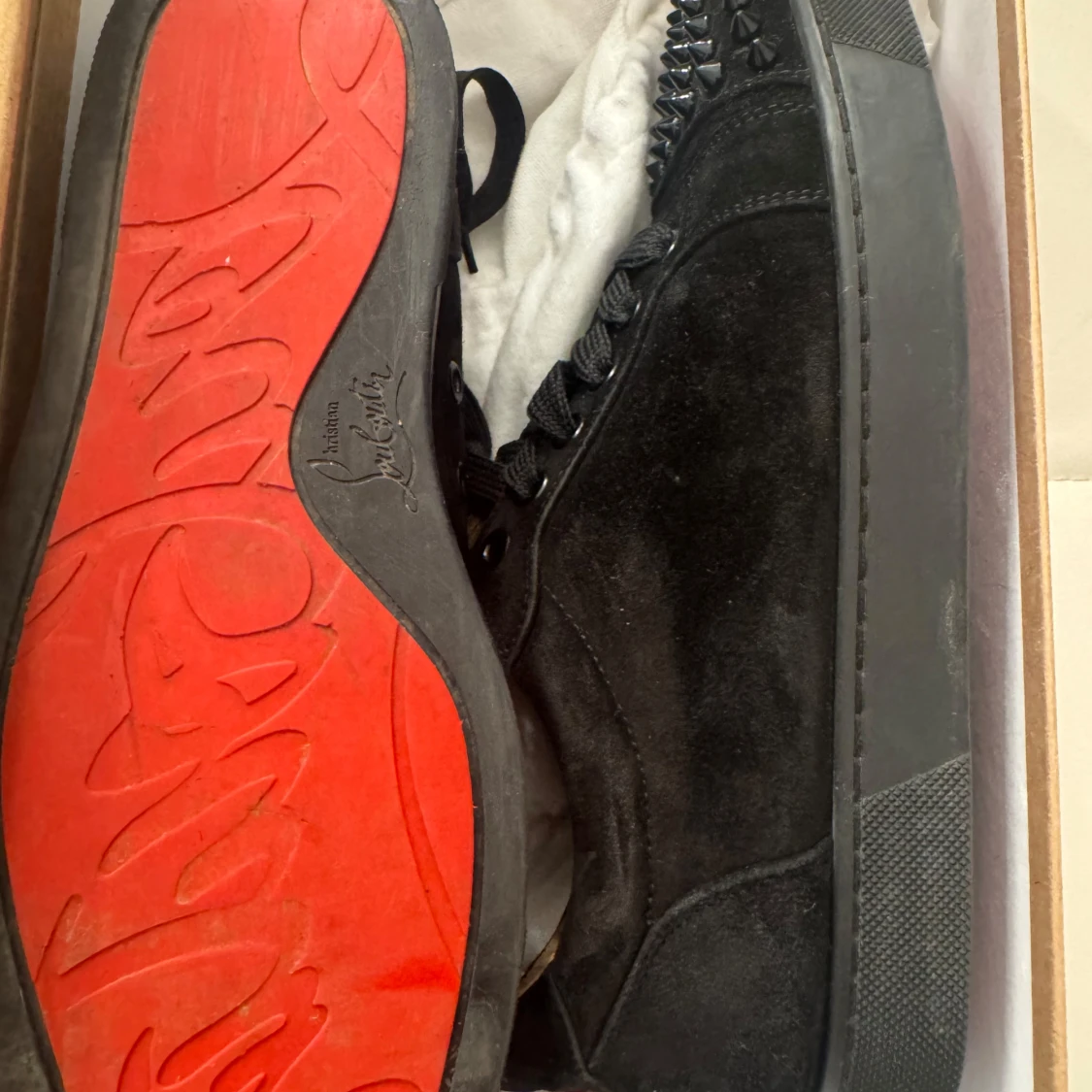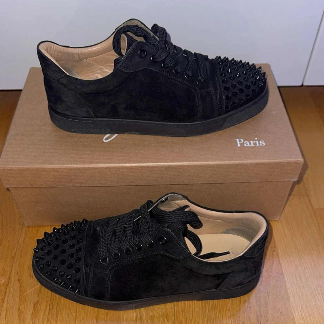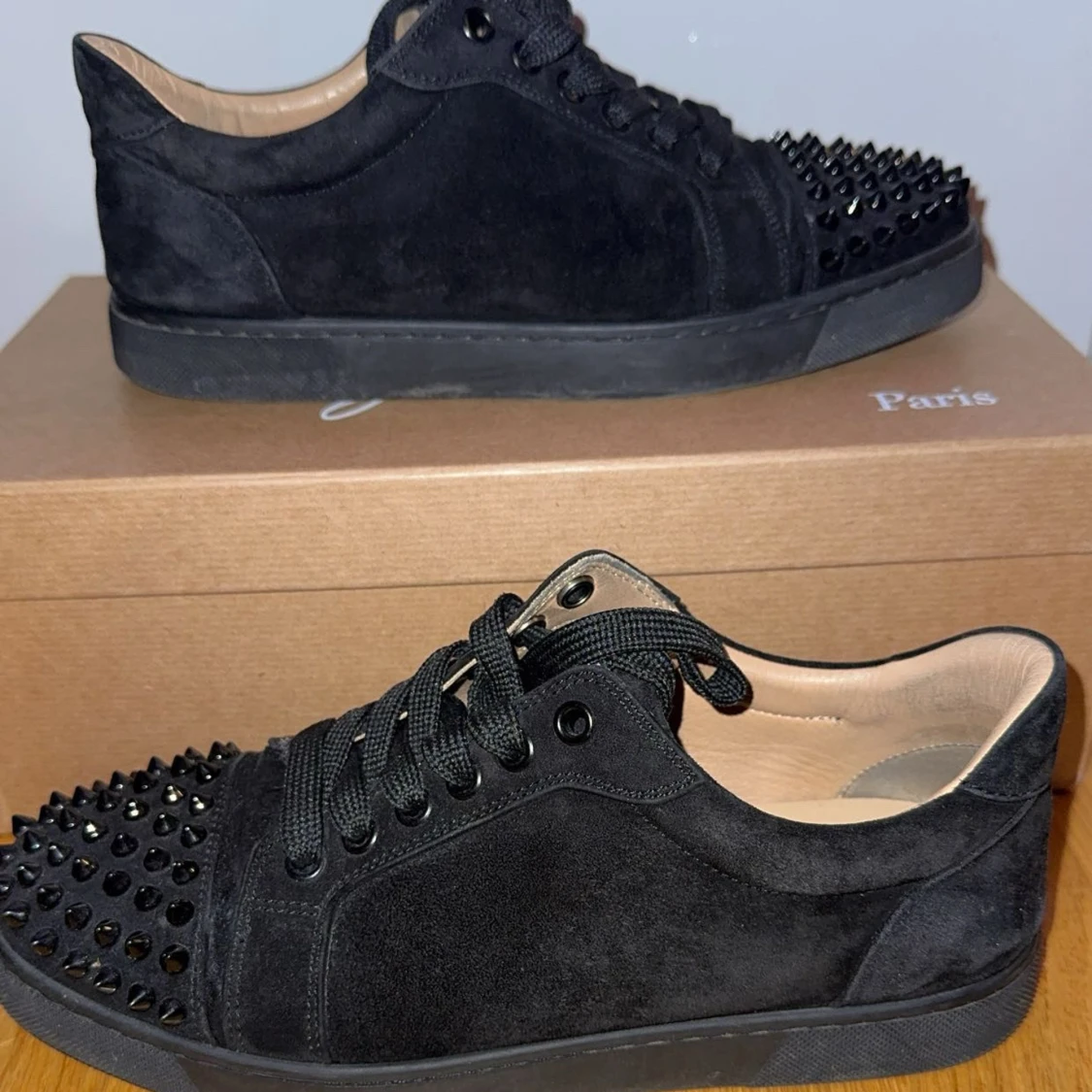 Svarta sneakers i mocka från Christian Louboutin med ikonisk röd sula och svarta nitar på tån. Skorna har snörning och rund tå, samt lyxig känsla med läderfoder. Perfekta för dig som vill sticka ut med edgy detaljer och exklusiv design.