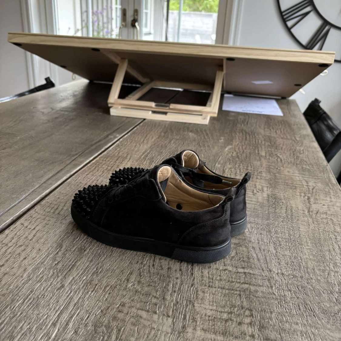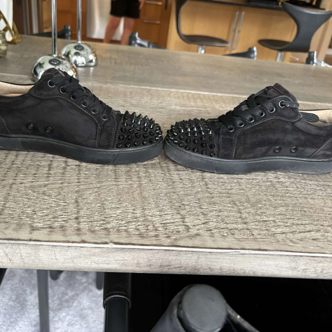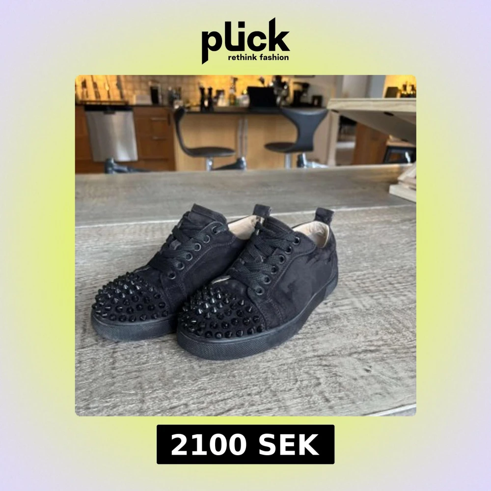 Svarta sneakers från Christian Louboutin i mocka med svarta nitar på tån och klassisk röd sula. Äkta, köpta i london för 8200kr för 2 år sen. Kommer inte till användning. Pris kan diskuteras, vill bara bli av med dem