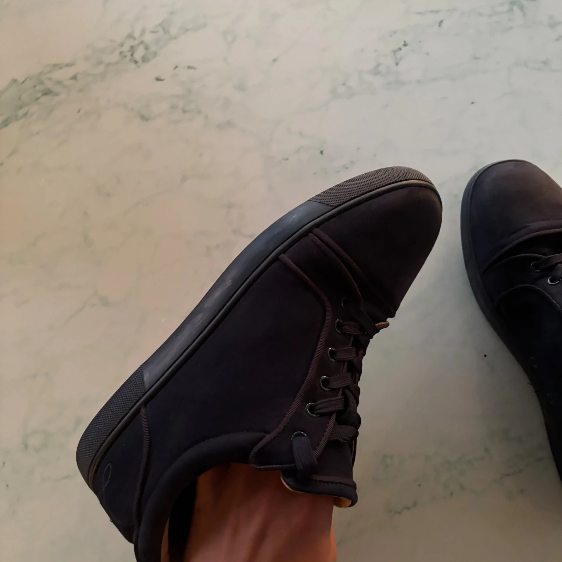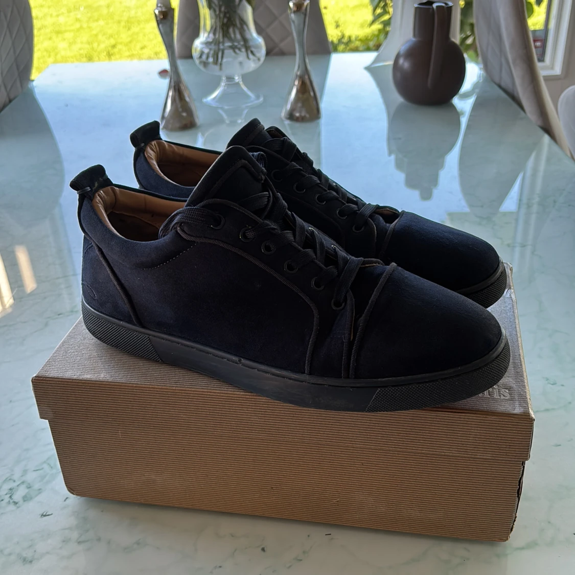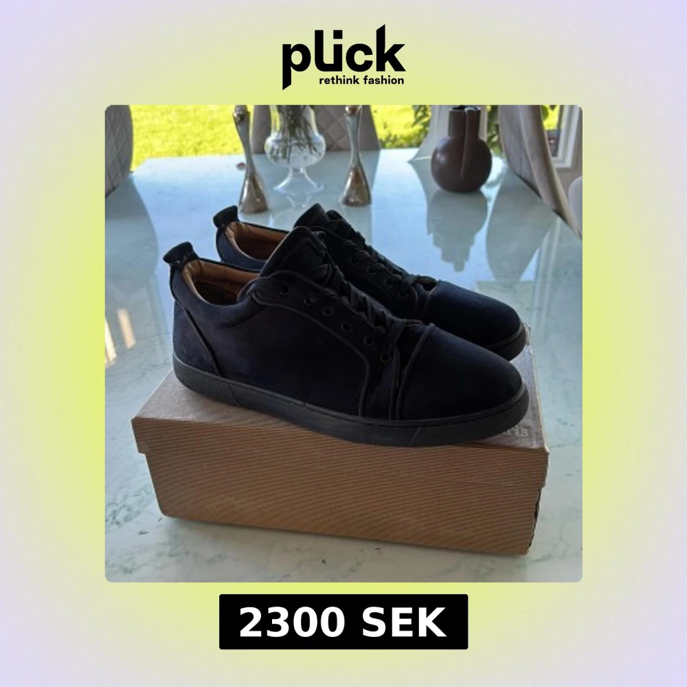 Exklusiva svarta sneakers från Christian Louboutin i mocka med klassisk röd sula. Snygg och stilren design med rund tå, svarta snören och diskreta detaljer. Kommer med originalkartong, dustbag och kvitto. Perfekta för dig som vill sticka ut med lyxig känsla.Skon är liten i storleken jag har 43/44 och skorna har 46 men dom passar mig bra.