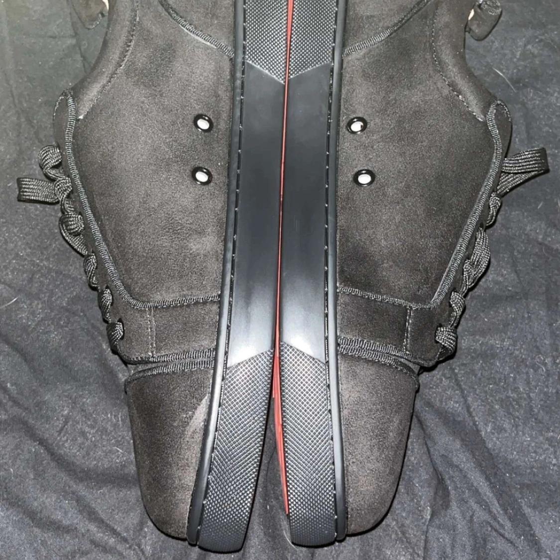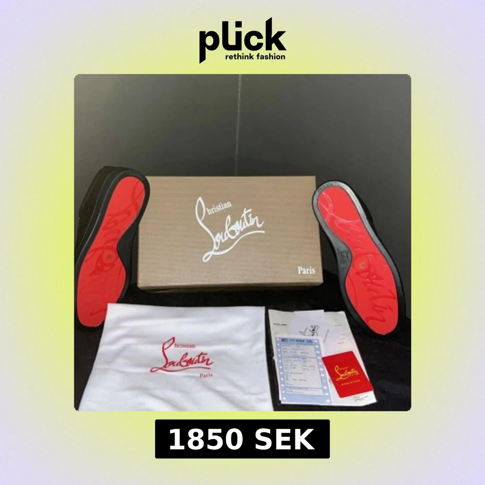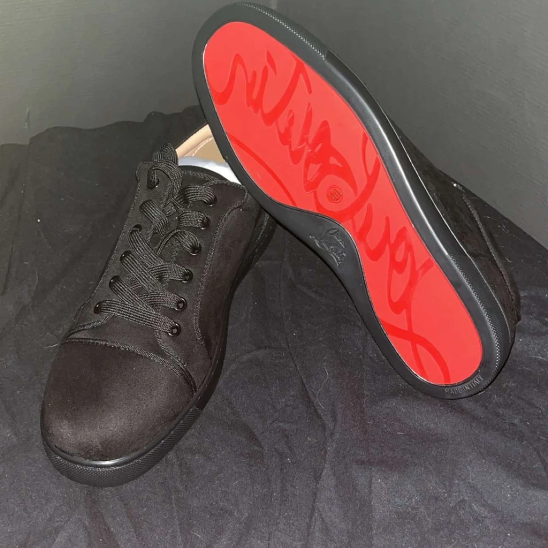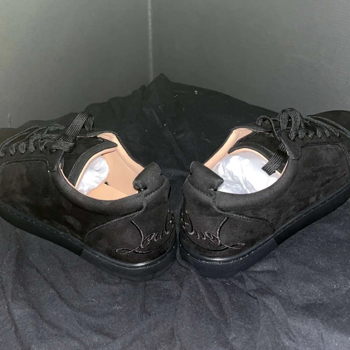 Snygga svarta sneakers från Christian Louboutin i mocka med klassisk röd sula och broderad logga på hälen.akopi. Skorna är storlek 44