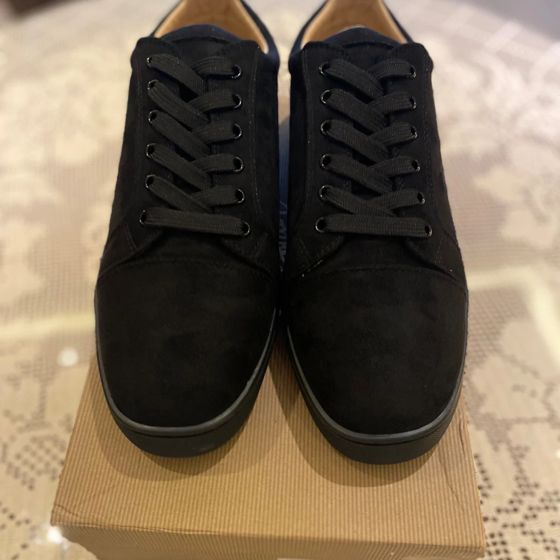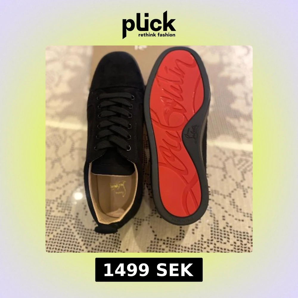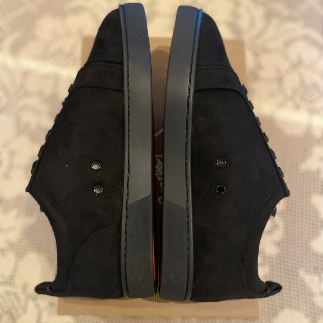 Svarta sneakers från Christian Louboutin i lyxig mocka med klassisk röd sula och diskret logga undertill. Skorna har rund tå, svarta snören och stilren design som sticker ut med den ikoniska röda undersidan.