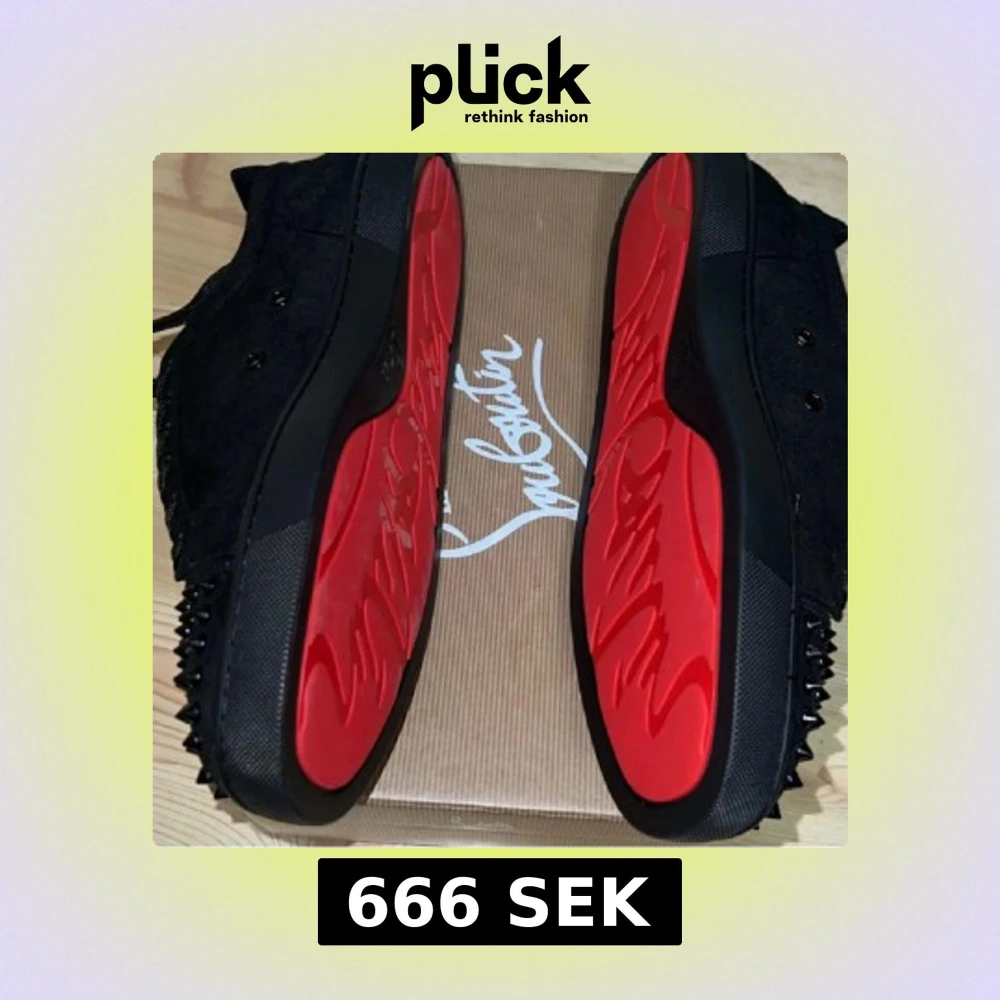 Svarta sneakers från Christian Louboutin i mocka med ikoniska röda sulor och svarta nitar på tån. Skorna har snörning och en platt sula. Perfekta för dig som vill sticka ut med en edgy och lyxig stil.