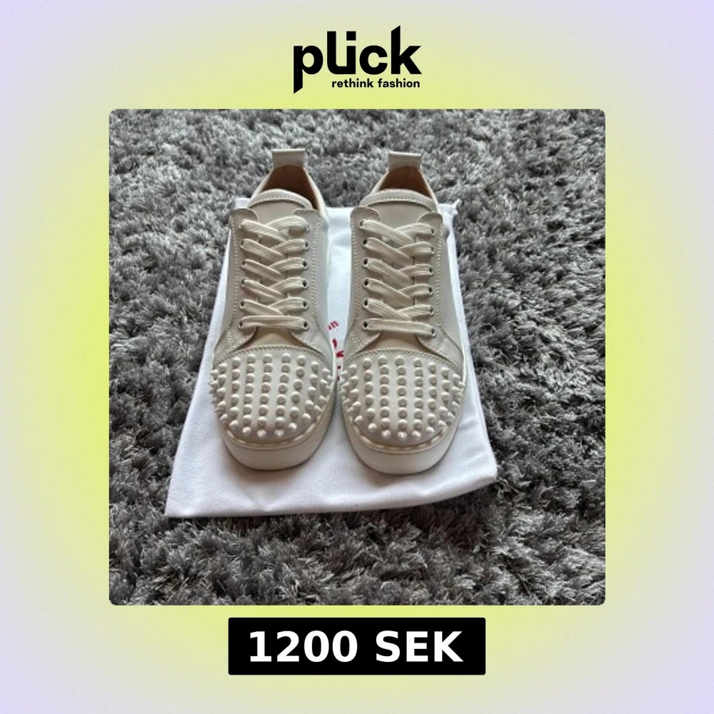Säljer ett par sjukt snygga vita sneakers från Christian Louboutin med coola vita nitar på tån och klassisk röd sula. Skorna har snörning och är gjorda i skinn med rund tå och platt sula. Perfekt för dig som vill sticka ut med exklusiv stil.