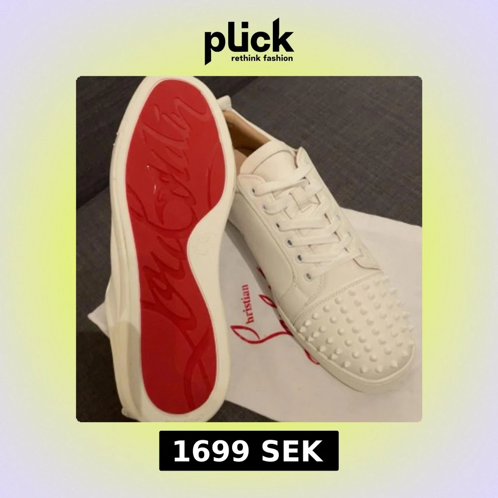 Exklusiva vita sneakers från Christian Louboutin i skinn med ikonisk röd sula och coola nitar på tån. Skorna har snörning och en stilren, modern look som sticker ut. Perfekta för dig som vill ha något unikt och lyxigt i garderoben.