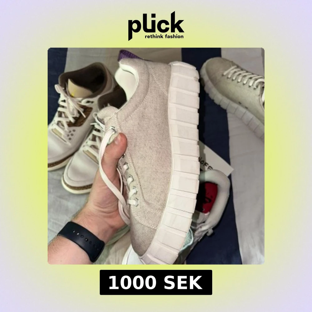 Säljer ett par stilrena sneakers från Eytys i beige linne canvas med chunky vit sula och klassisk snörning. Skorna har en lila detalj på hälen och Eytys-logga på plösen och innersulan. Perfekta för dig som gillar minimalistisk och modern stil. Storlek 44 (US10/WMNS11,5) låda saknas och hälarna är slitna som syns på bilderna. Annars är dom i helt magiskt skick helt utan hål eller så!