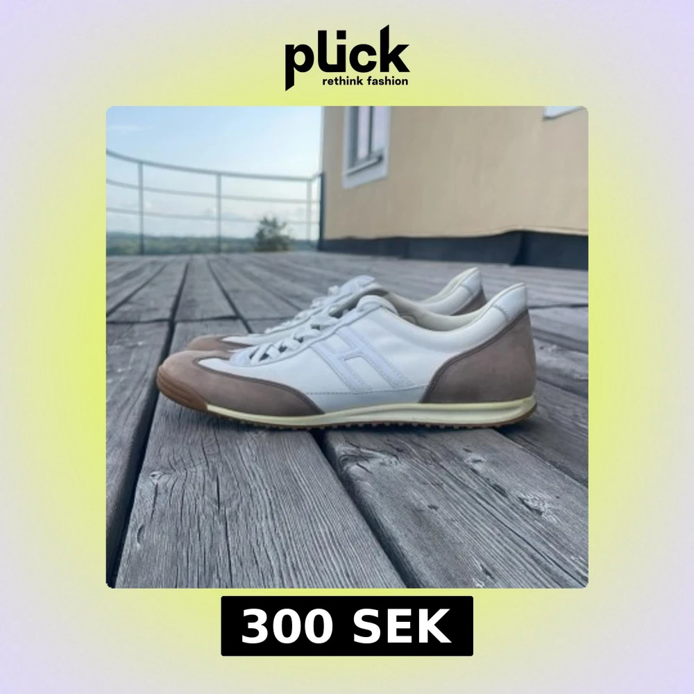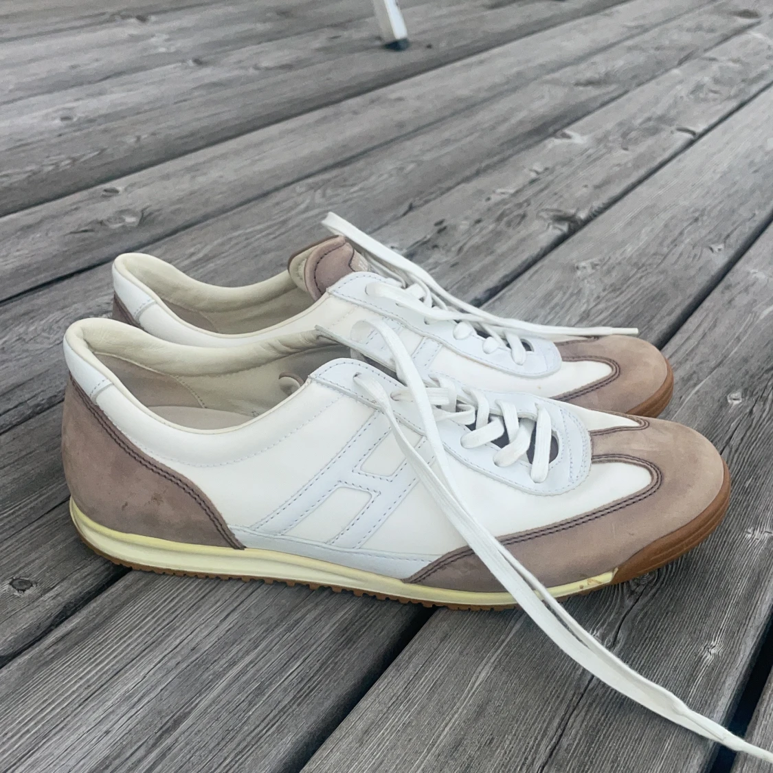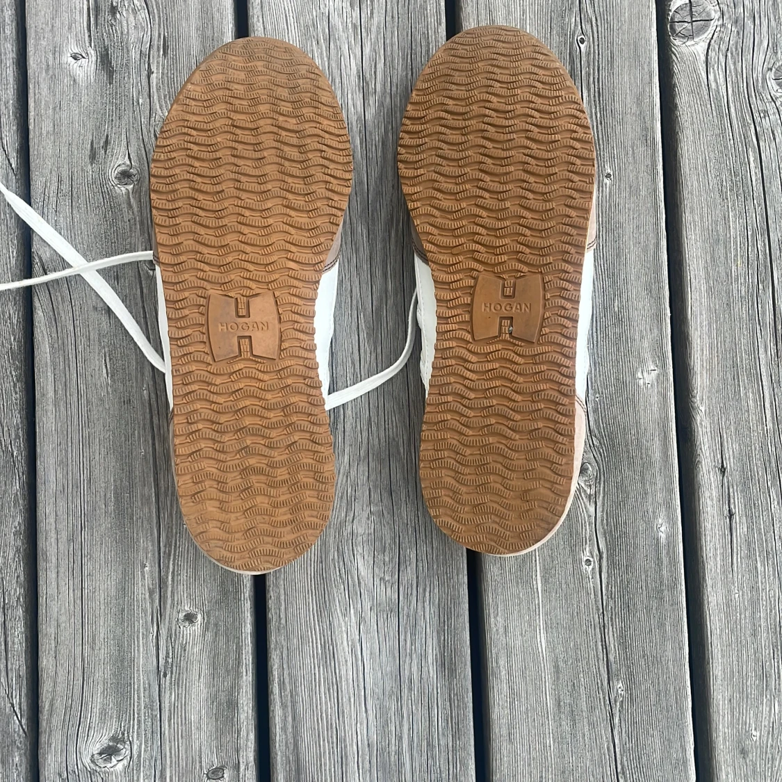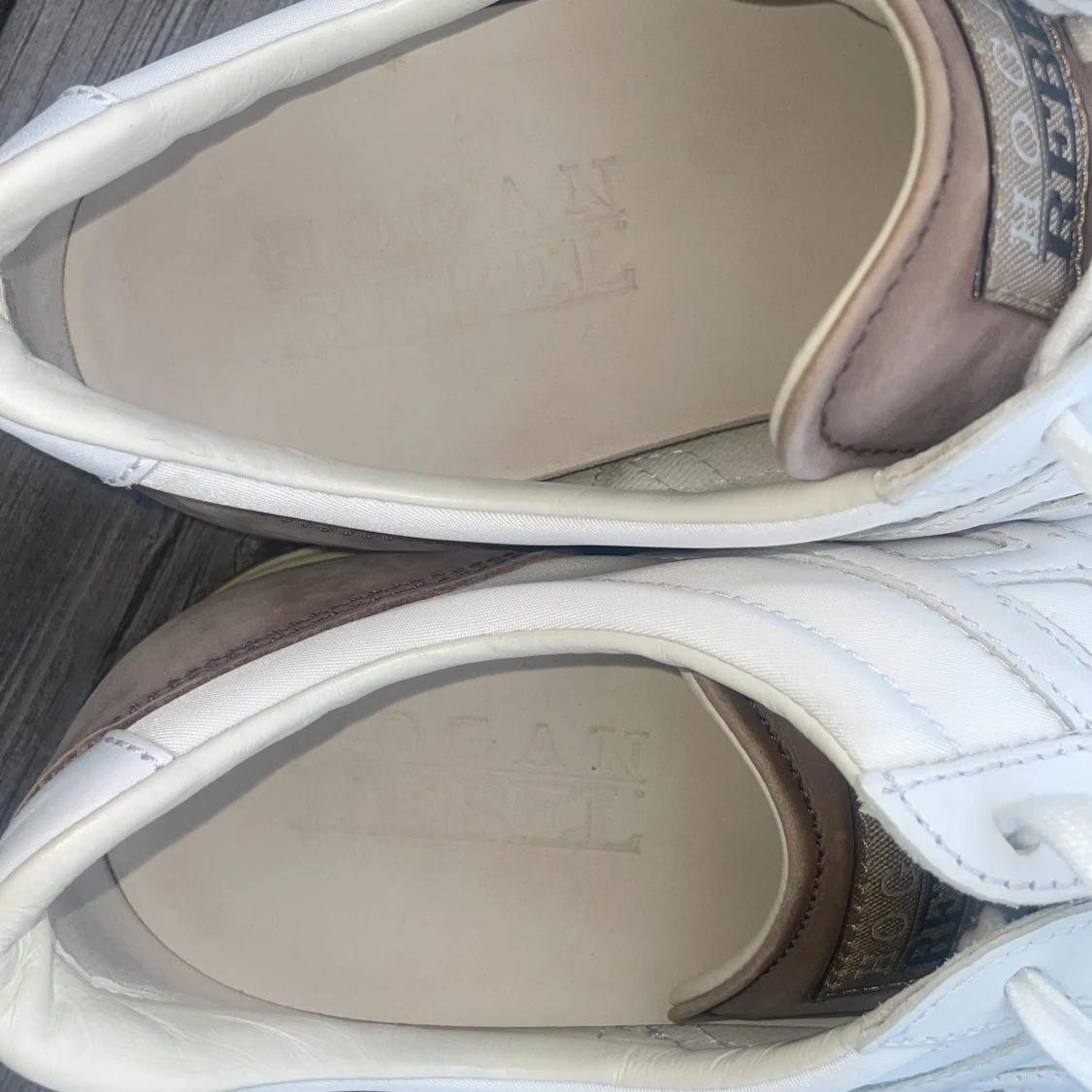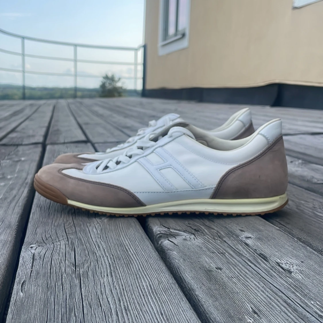 Snygga Hogan Rebel sneakers i vitt skinn med beige mockadetaljer och bruna gummisulor. Klassisk retrostil med rund tå, snörning och diskret H-logga på sidan. Perfekta för dig som gillar stilrena och sportiga skor med premiumkänsla.