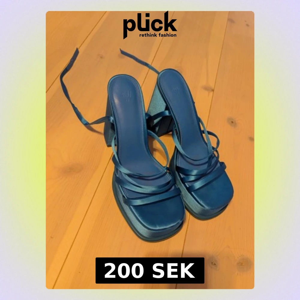 Snygga blå klackar från H&M med bred plattform och hög klack. Skorna har smala band över foten och runt vristen med litet spänne, samt en fyrkantig tå. Materialet har en satinlik finish som ger en cool glans. Perfekt för dig som gillar statement-skor.