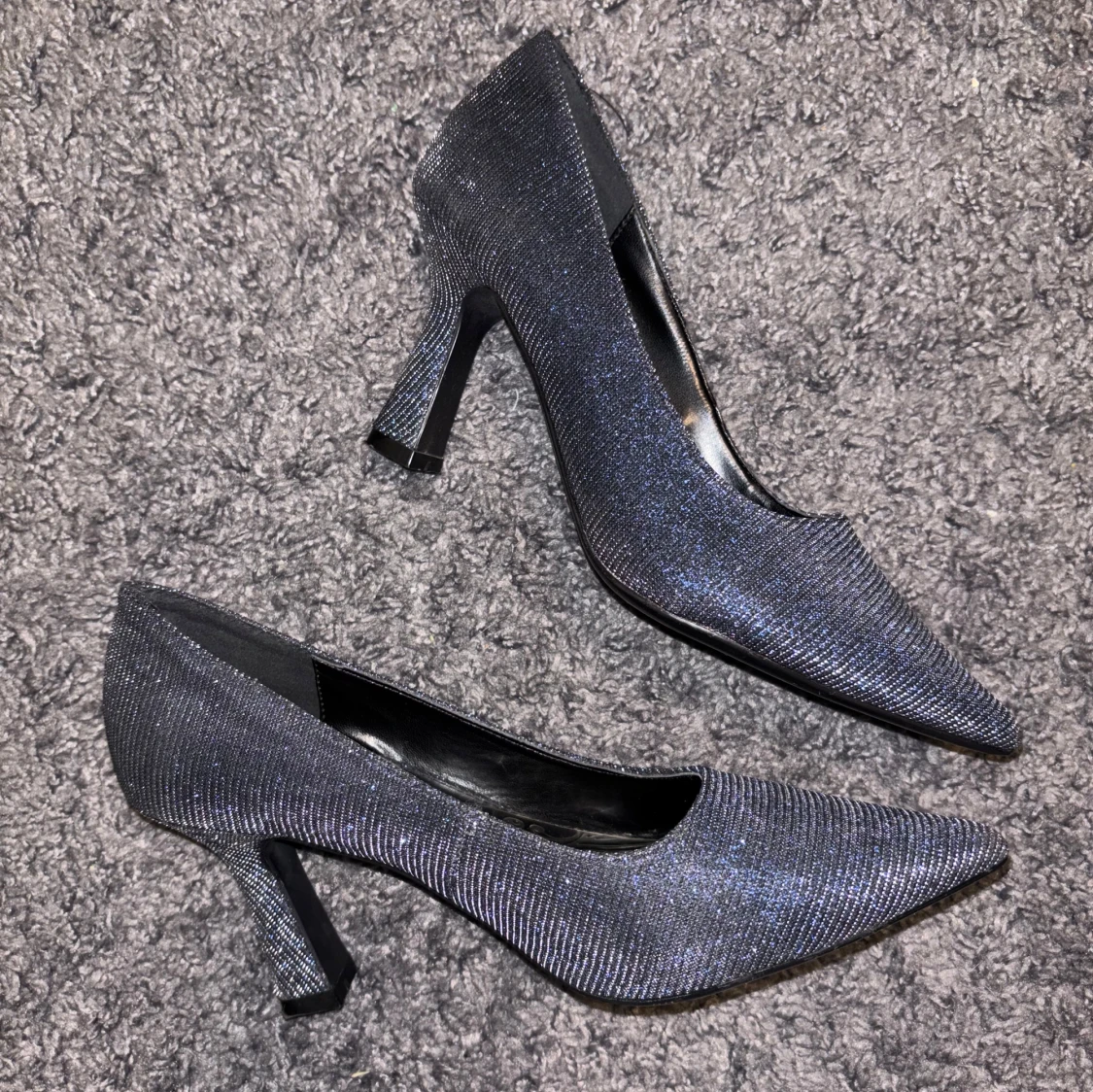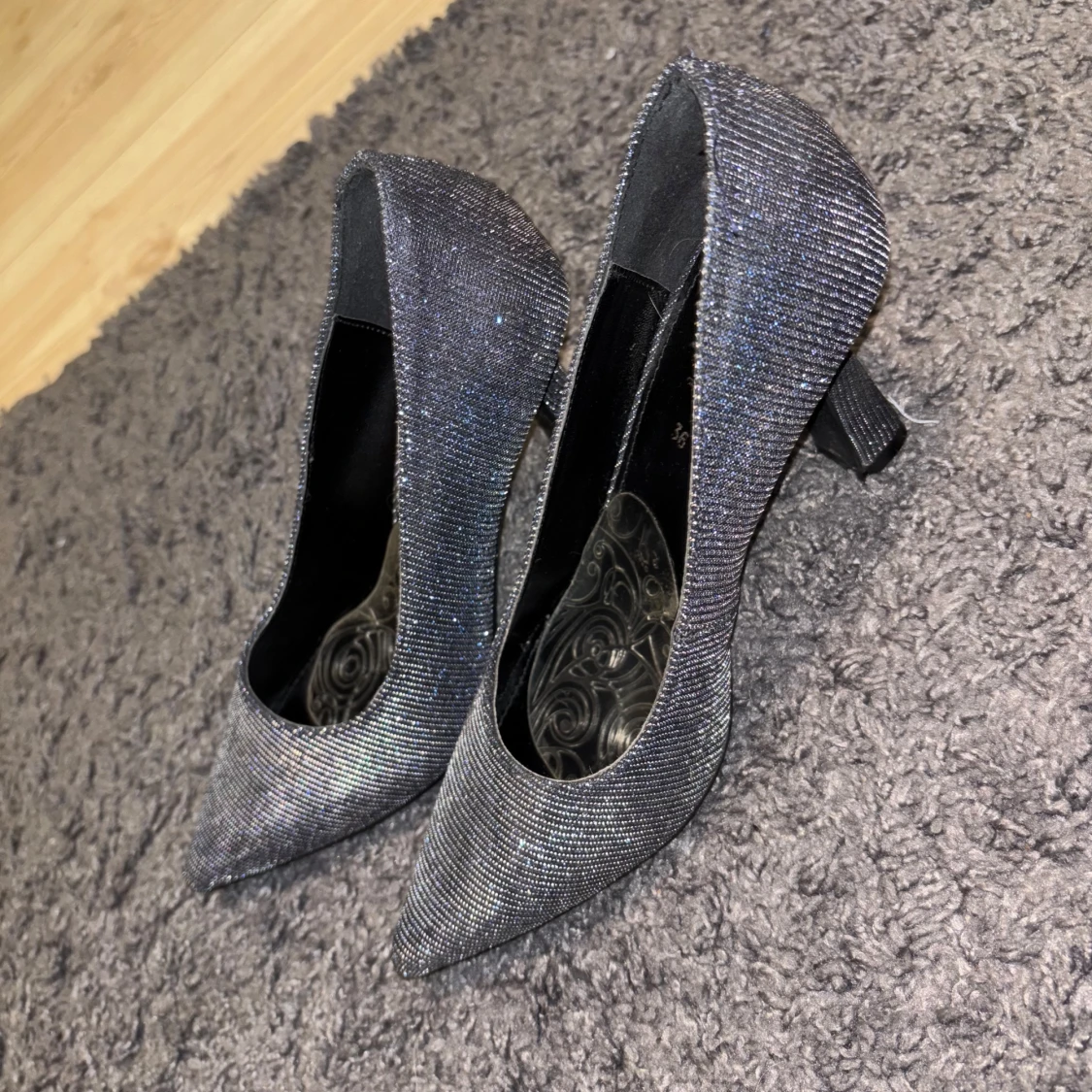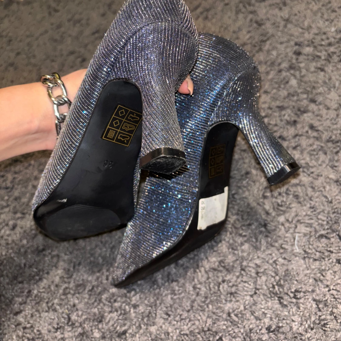 Snygga glittriga klackar i glittrigt blått med spetsig tå och klack. Perfekta för att ge en extra touch till din outfit. De har en elegant design som passar till många tillfällen. Storleken är 36 men passar mig som har 37-38. Bara använda 3 gångermed extrainlägg innuti för bekvämlighet 💕 priset är diskuterbart 💕💕💕