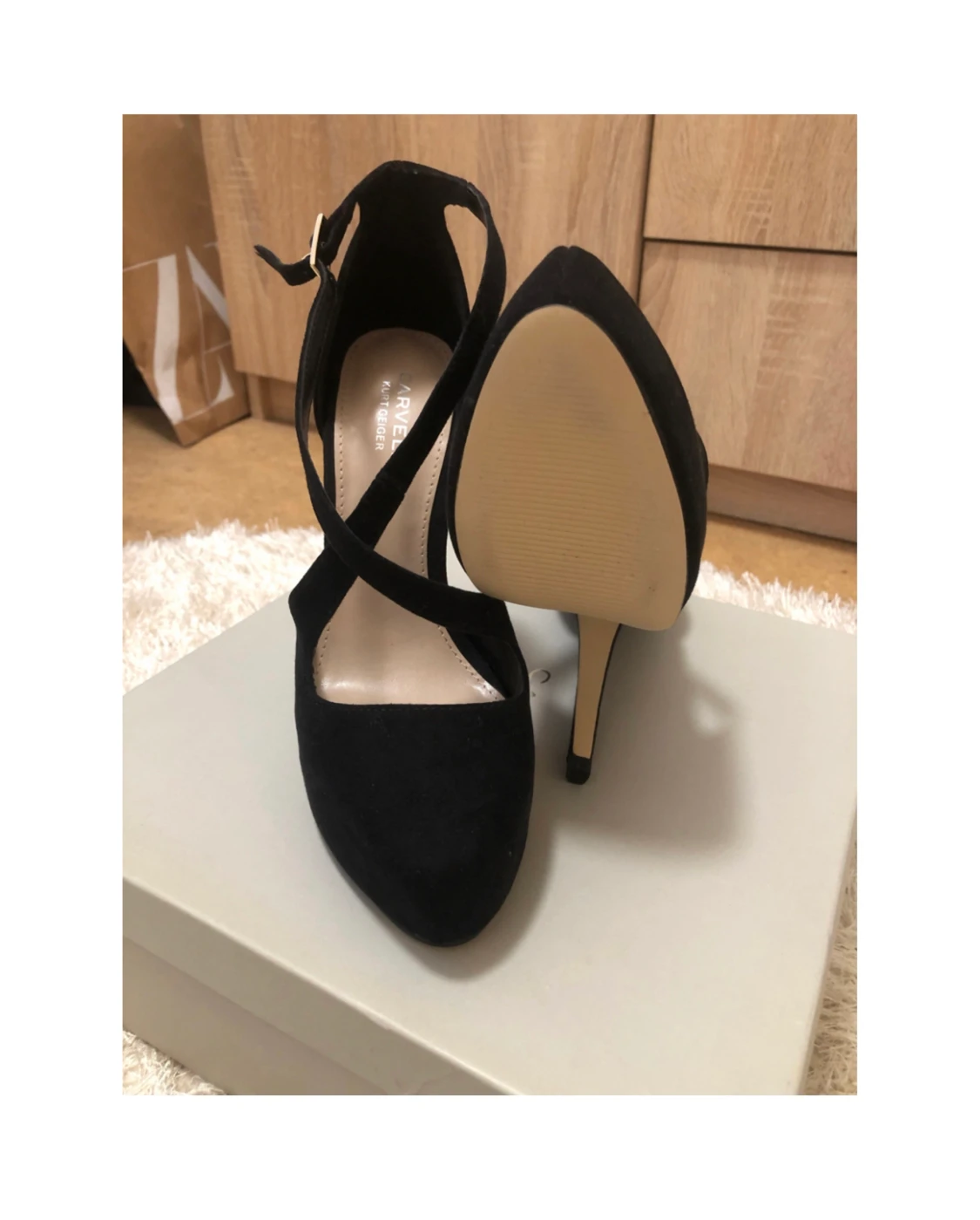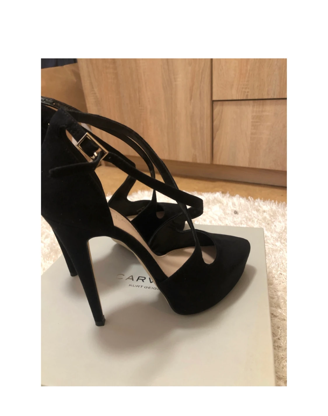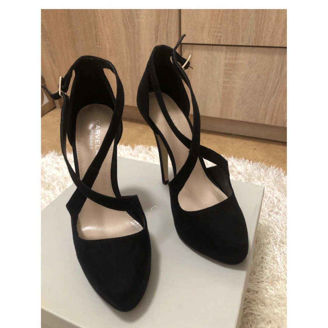Aldrig använda, högklackade pumps/sandaletter från Kurt Geiger Carvela. Svarta suede.