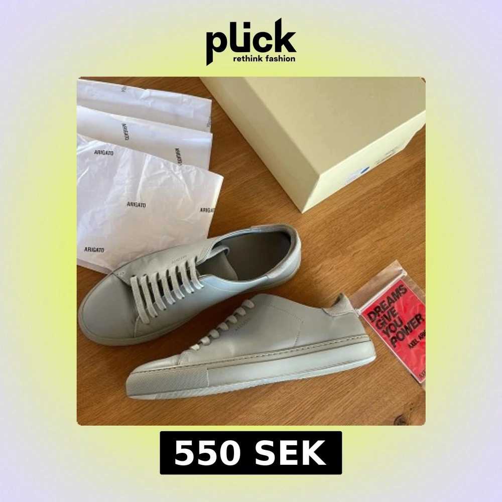 Säljer ett par stilrena grå sneakers från Axel Arigato med klassisk design. Skorna har rund tå, platt sula och snörning framtill. Tillverkade i skinn med diskret logga på sidan. Perfekta för en clean och modern look.