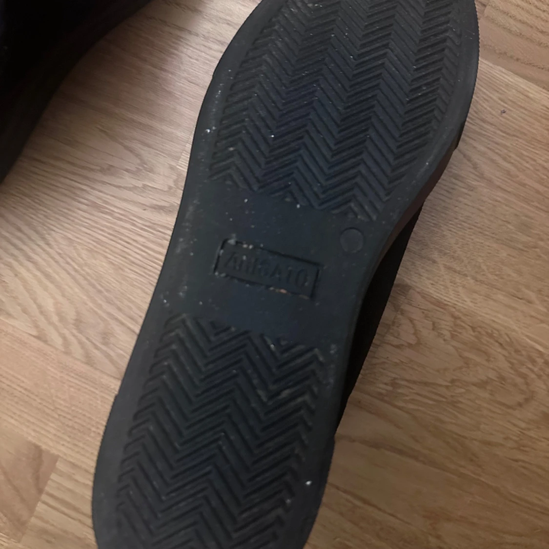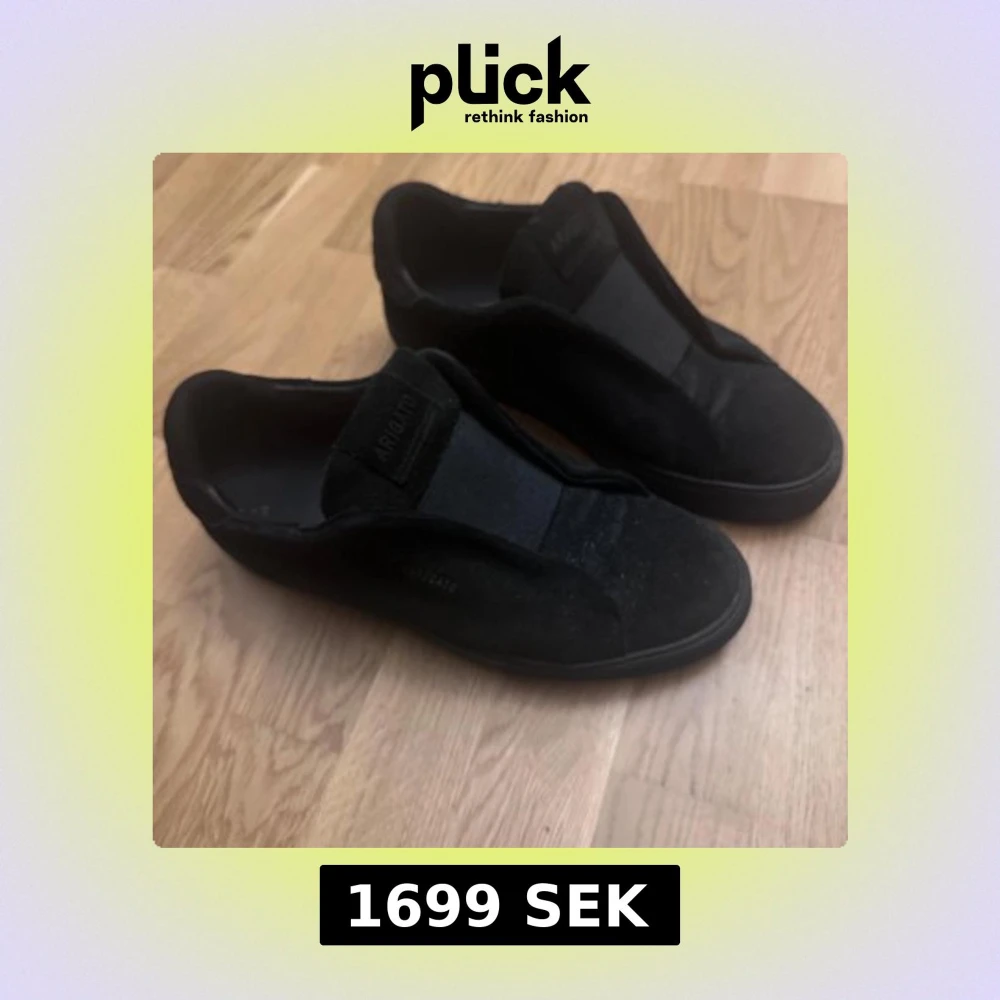 Stilrena svarta sneakers från Axel Arigato i mocka med diskret logga på sidan och på plösen. Skorna har en platt sula och minimalistisk design utan snörning, vilket ger en clean look. Perfekta för dig som gillar enkel och modern stil. Använd fåtal gånger. Bra skick, pris kan diskuteras vid snabb affär