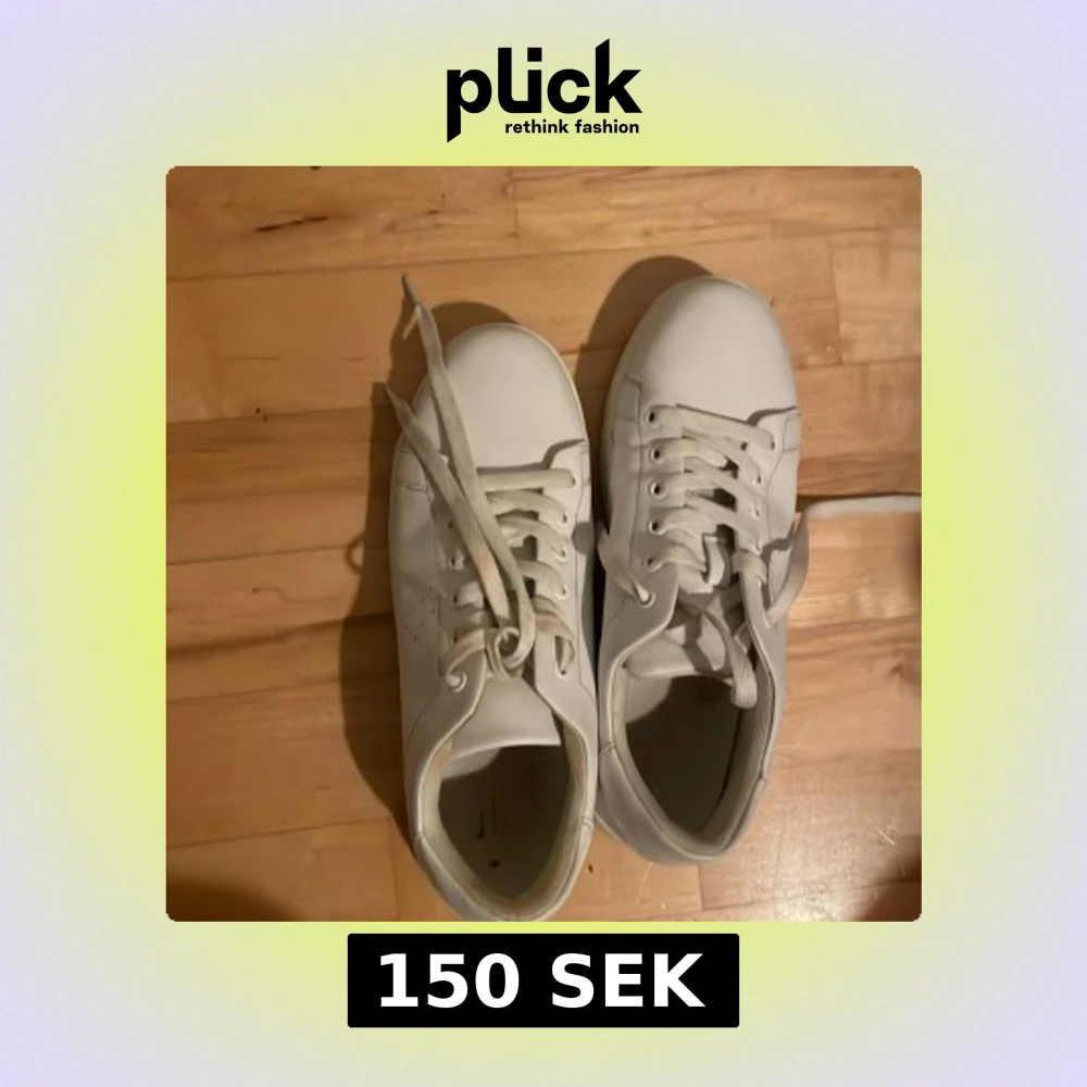 Stilrena vita sneakers med rund tå och platt sula. Skorna har snörning och har diskreta perforeringar på sidan. Perfekta för en clean och enkel look, passar till det mesta i garderoben. Pris: 150kr men kan gå ner vid en snabb affär.
