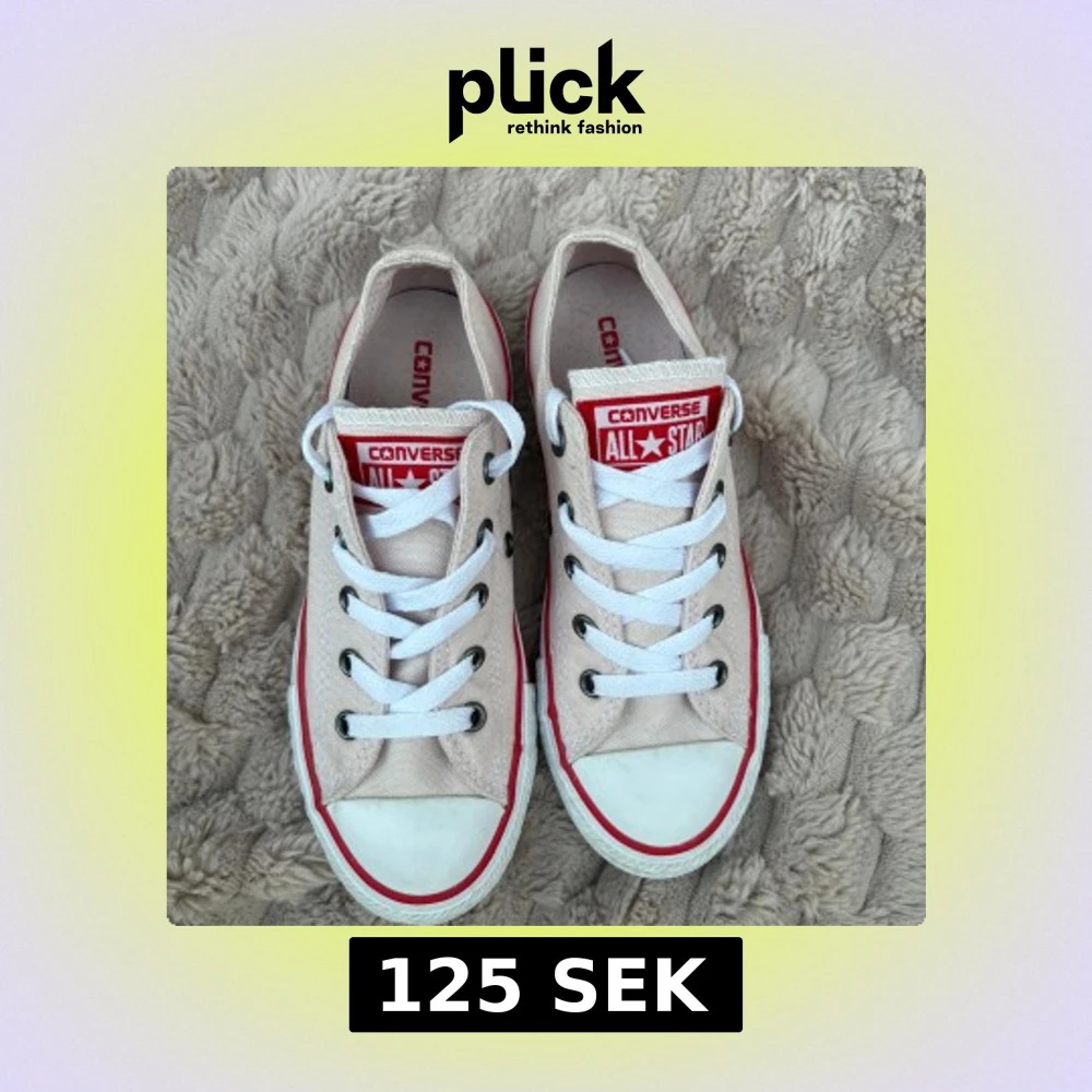 Säljer ett par klassiska NYA Converse All Star sneakers i ljusrosa canvas med vit tå och sula, samt röda detaljer runt sulan och på loggan. Skorna har vita snören, metallfärgade öljetter och rund tå. Perfekt för dig som gillar tidlös streetstil. Stl.32 innermått; 19,5 cm