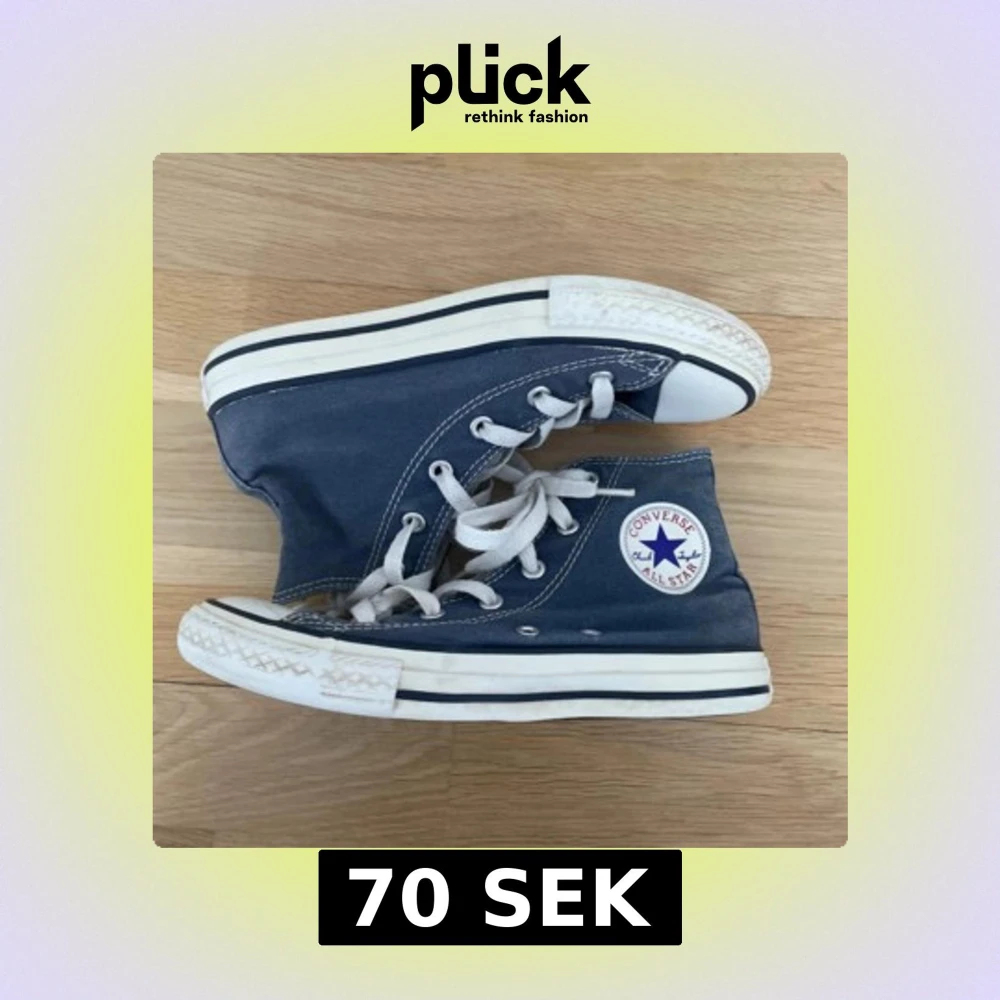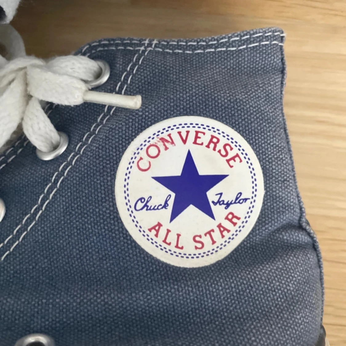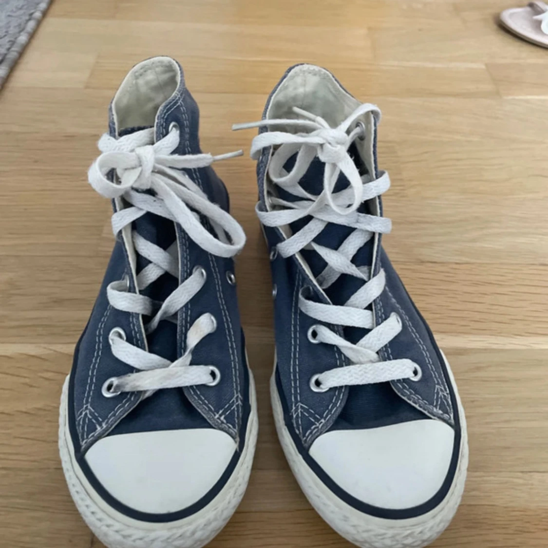 Säljer ett par klassiska Converse Chuck Taylor All Star sneakers i blått med vita snören och vit gummisula. Skorna har högt skaft, rund tå och tydliga vita sömmar. Ikonisk logga på sidan och platt sula. Perfekta för dig som gillar retrostil och streetwear.