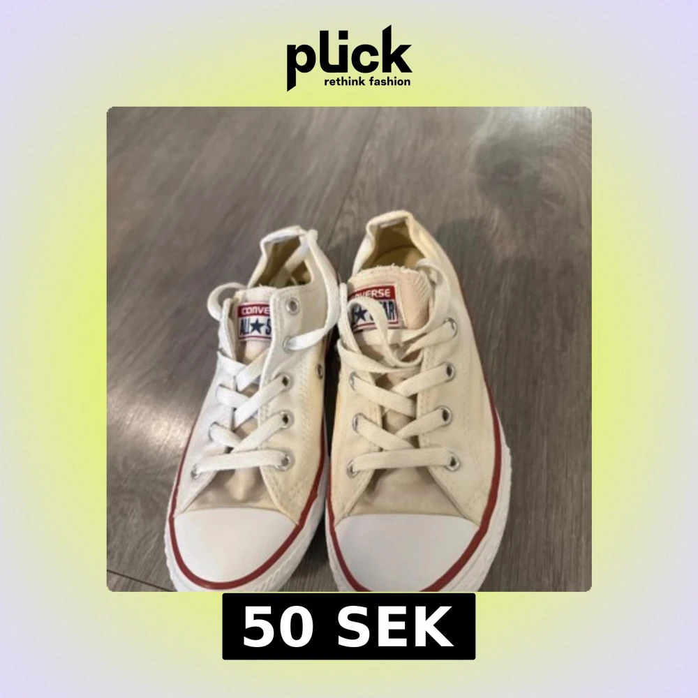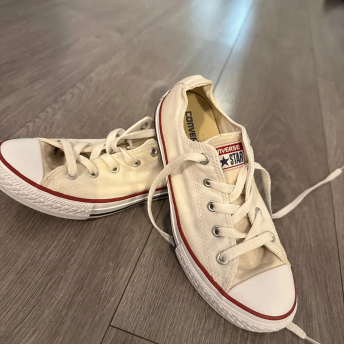 Klassiska vita Converse All Star sneakers i lågt snitt med röd rand längs sulan. Skorna har rund tå, platt sula och snörning framtill. Tillverkade i canvas med gummidetaljer och logga på plösen. Perfekta för en avslappnad och cool stil.