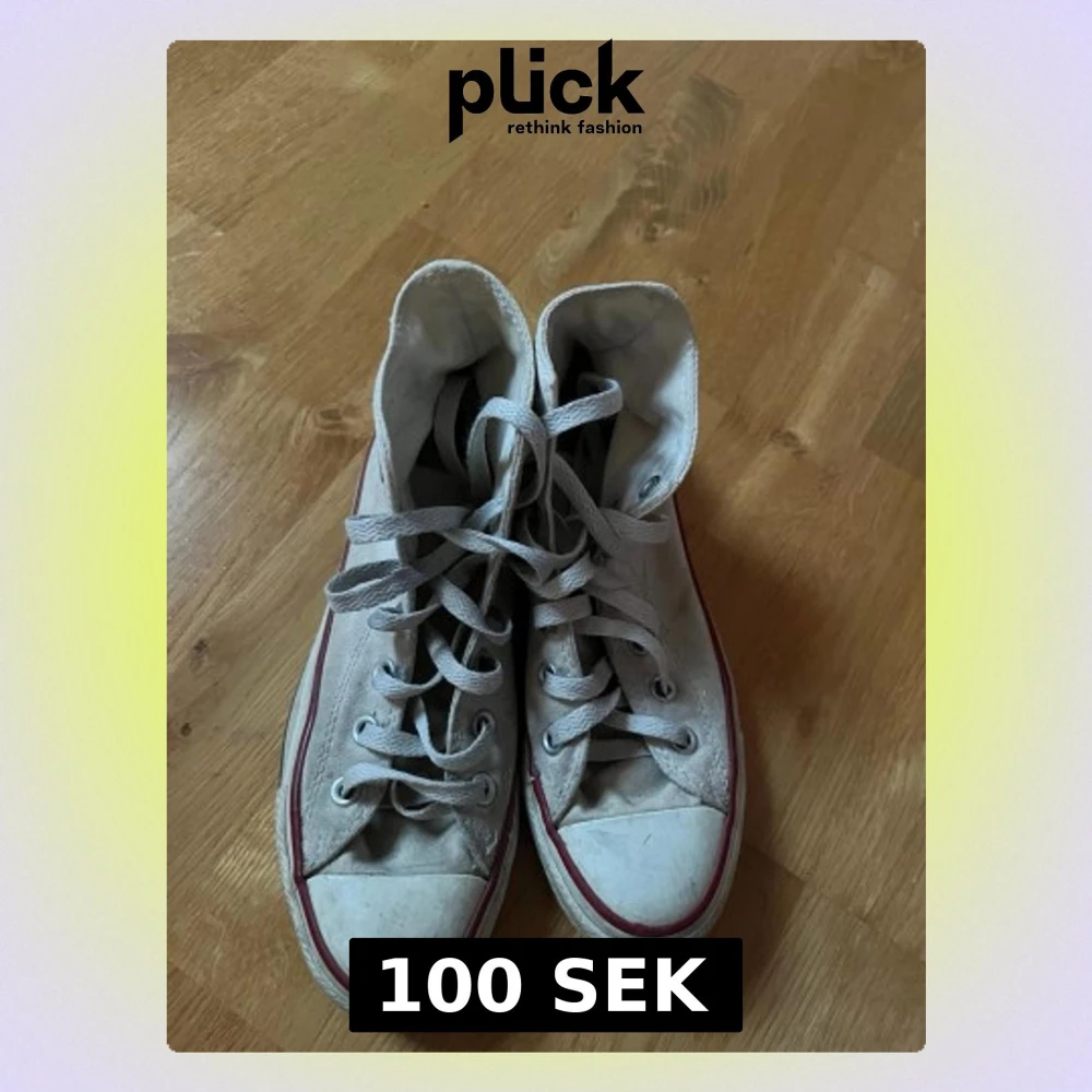 Säljer ett par klassiska höga vita Converse med röd rand runt sulan. Skorna har snörning, rund tå och gummisula. Converse-loggan syns på sidan. Perfekta för dig som gillar retrostil.