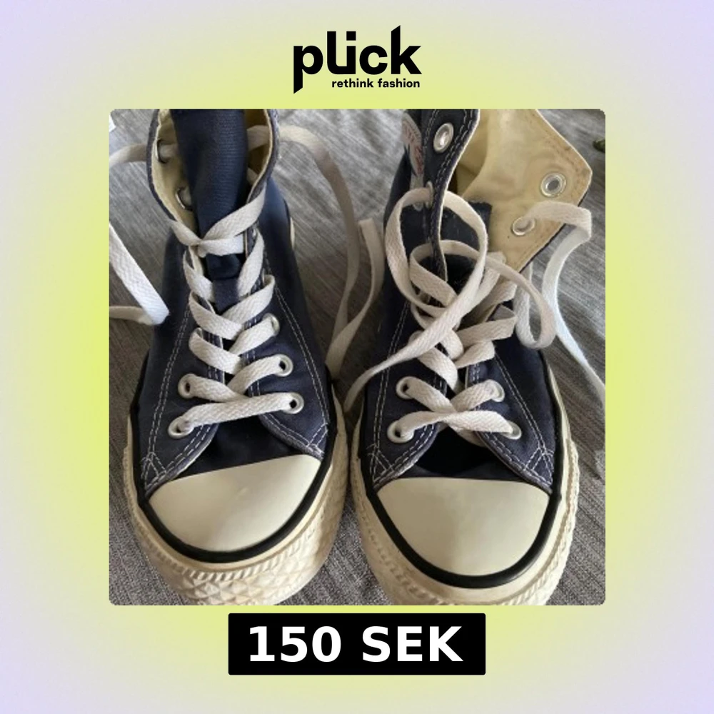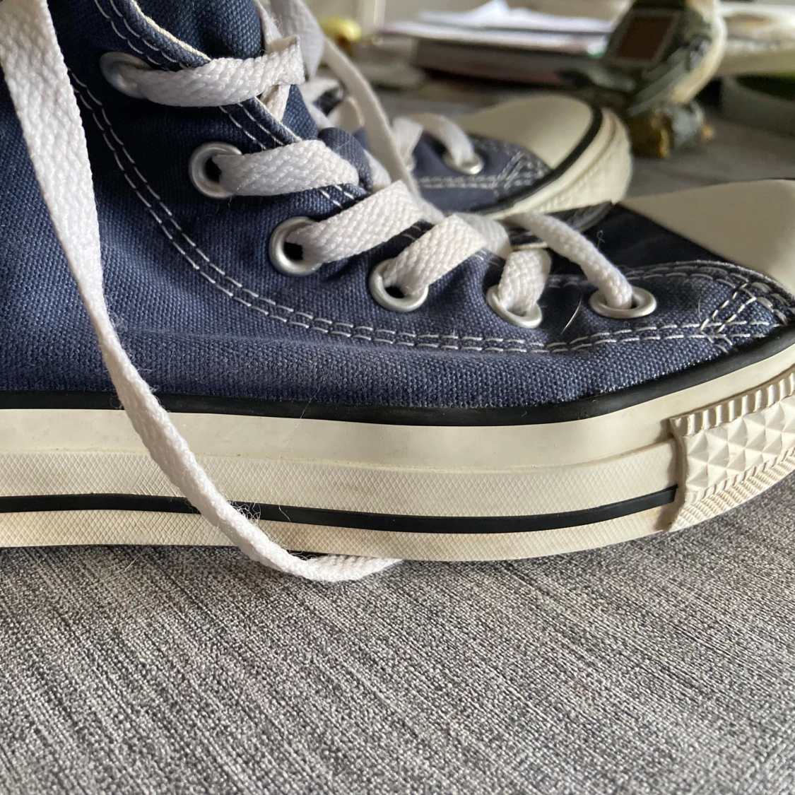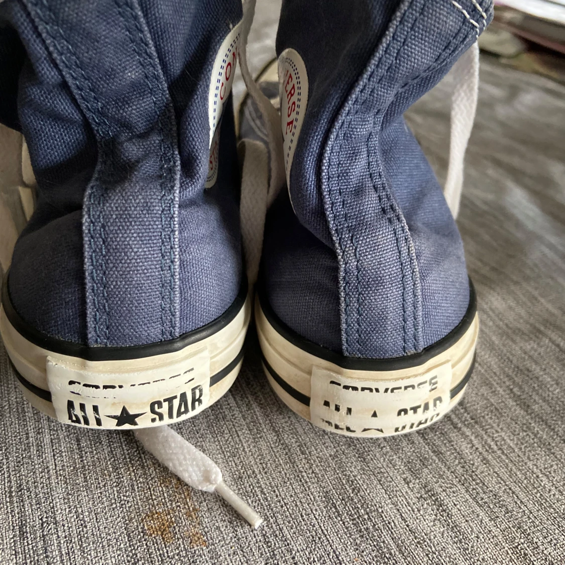Säljer ett par klassiska blå Converse All Star high-top sneakers med vita snören och gummitå. Skorna har vit sula med svart rand och tydlig logga på baksidan. Perfekta för en avslappnad och cool stil.
