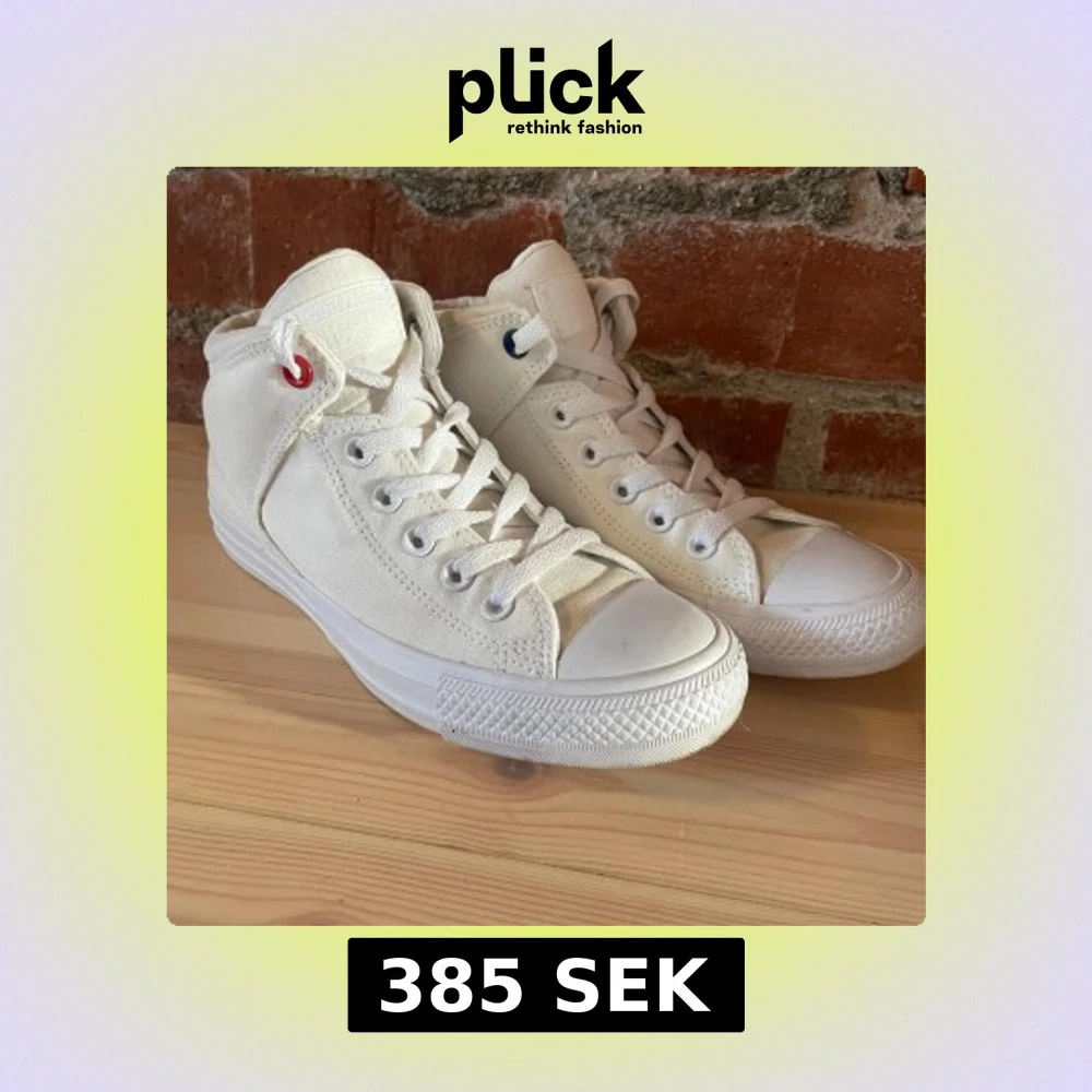 Säljer ett par klassiska vita Converse All Star sneakers i canvas med högt skaft. Skorna har snörning med en röd och en blå detalj i översta öljetterna, rund tå och platt sula i gummi. Perfekta för dig som gillar en clean och tidlös stil.