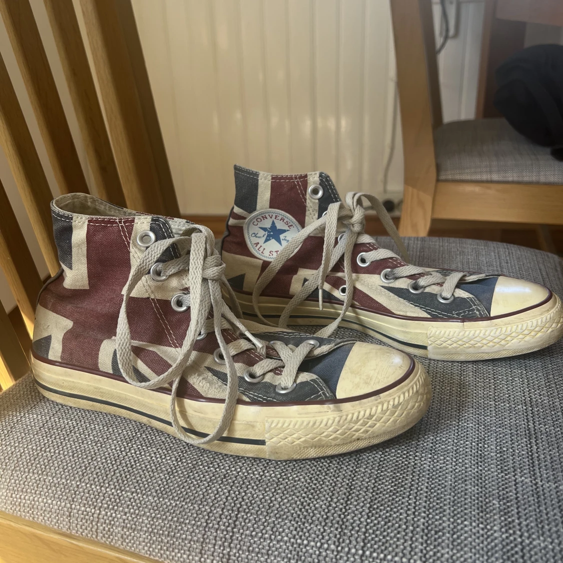 Coola Converse i strl 37, med brittiska flaggan. Skorna ska se slitna ut, var alltså köpta med slitningarna . Bra begagnat skick.