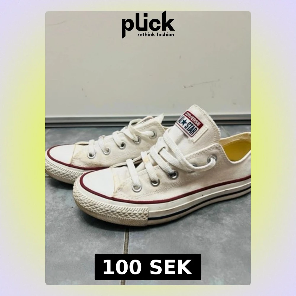 Klassiska vita Converse All Star sneakers med lågt skaft, vita snören och röd rand längs sulan. Ikonisk logga på plösen och tåhätta i gummi. Tillverkade i canvas för en avslappnad och tidlös look.