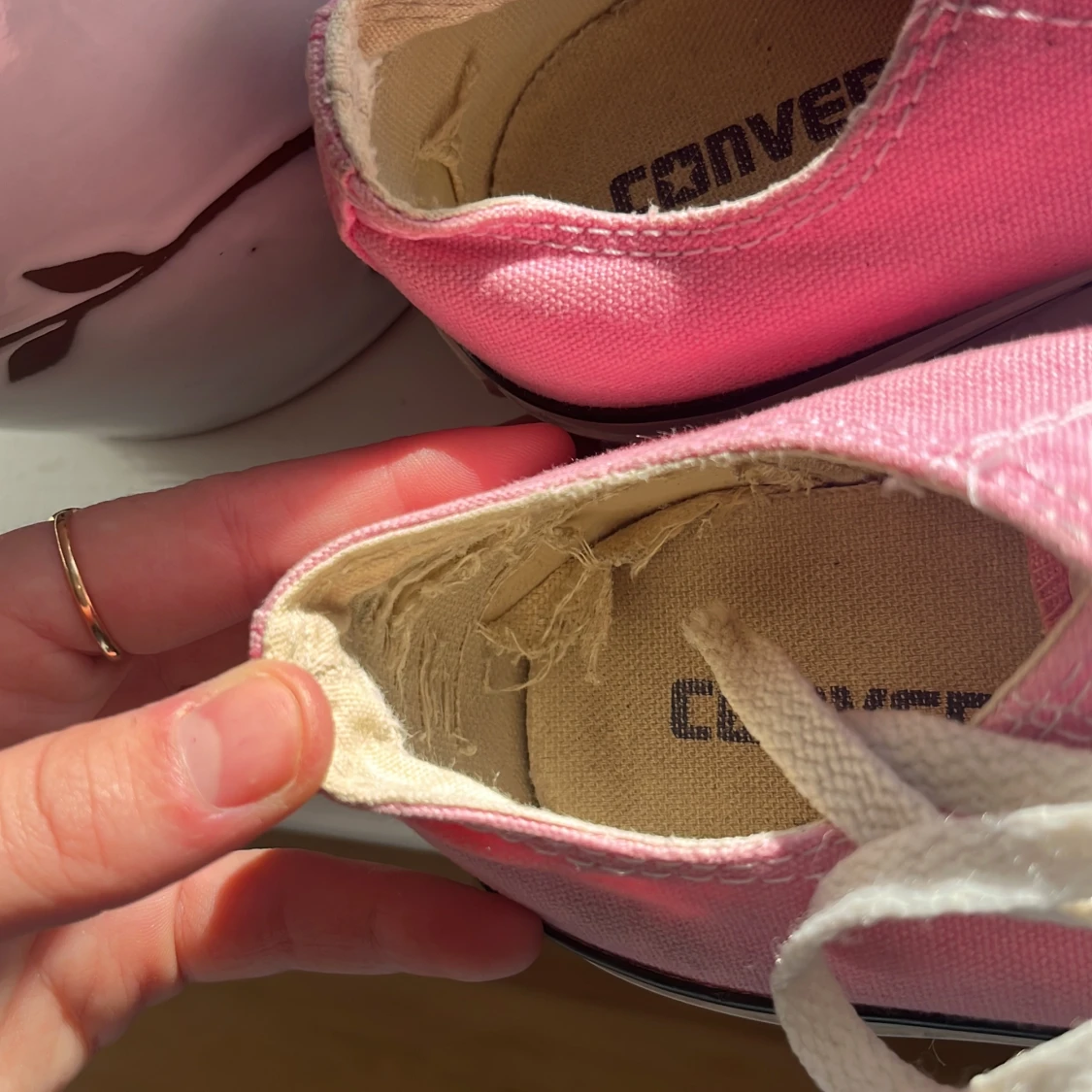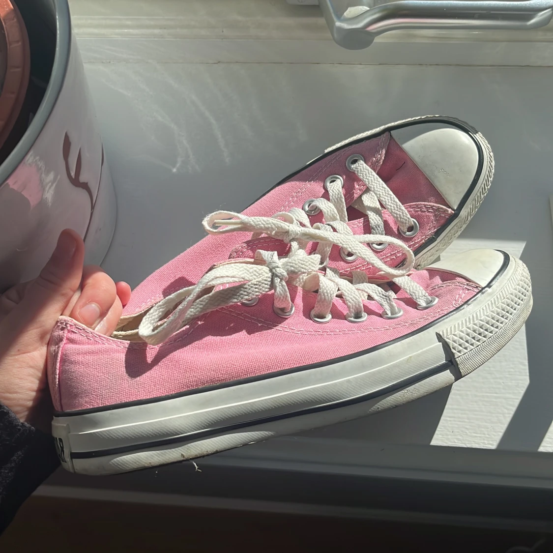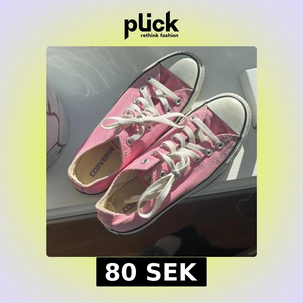 Säljer ett par klassiska Converse sneakers i en snygg rosa färg med vita snören och tåhätta. Skorna är låga och har en platt sula, tillverkade i canvas med gummidetaljer. Perfekta för dig som vill ha en poppig färg på fötterna. Lite slitningar inne i skorna, men inget som påverkar!💕