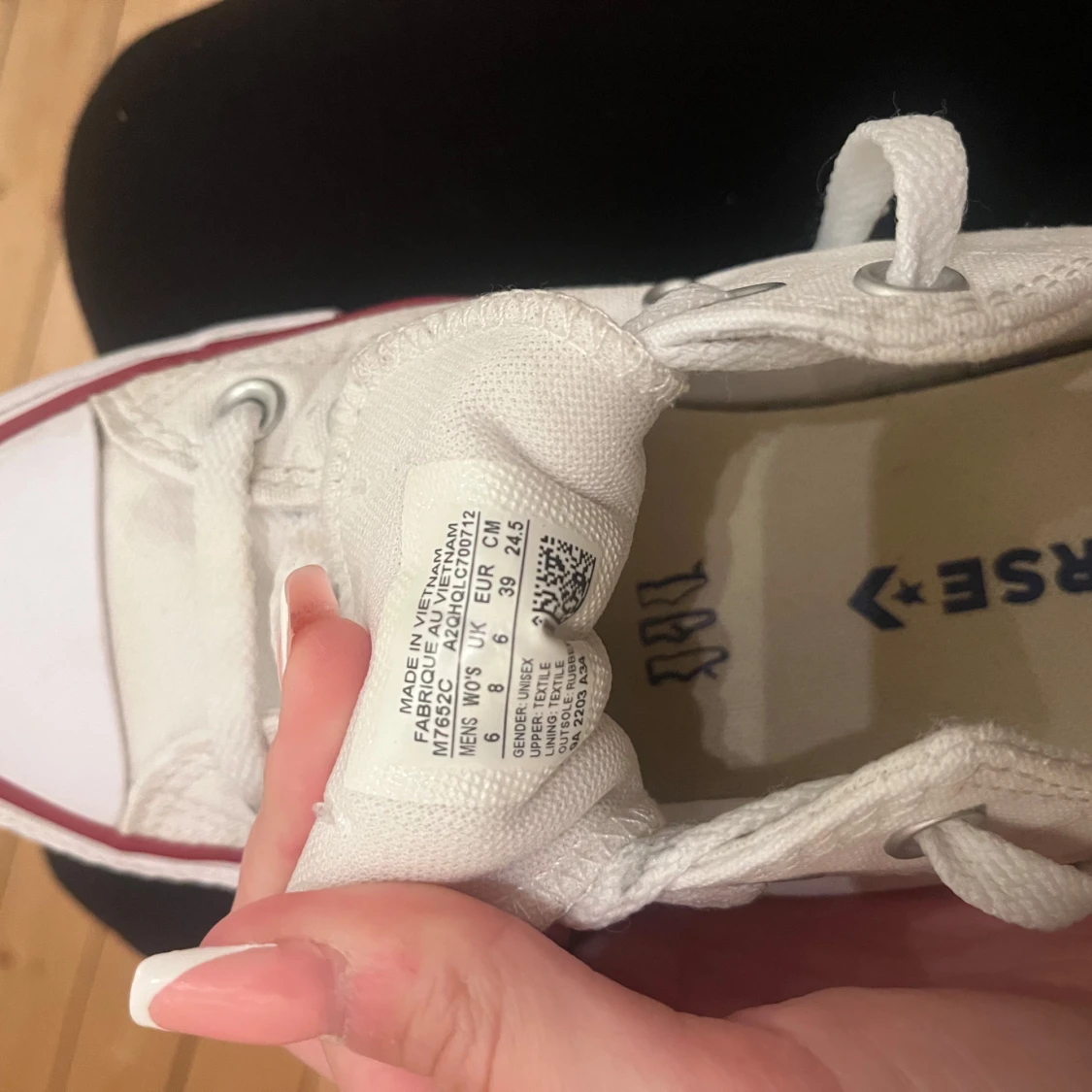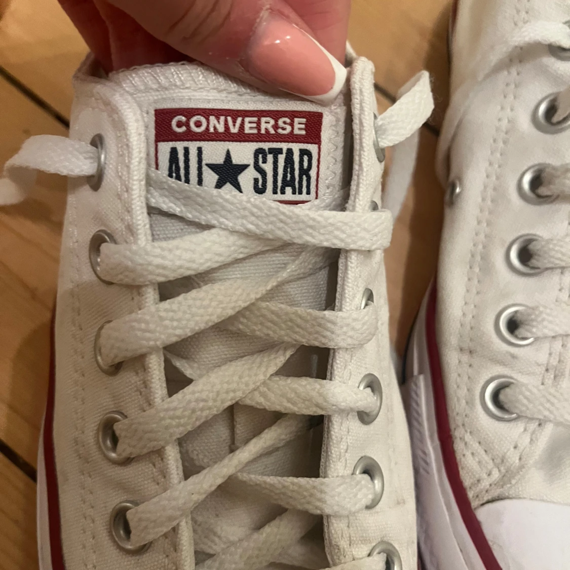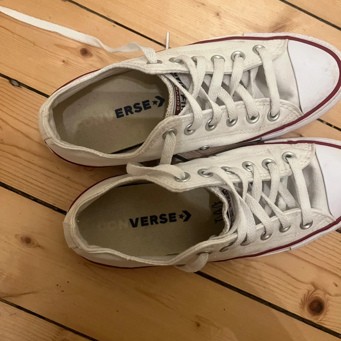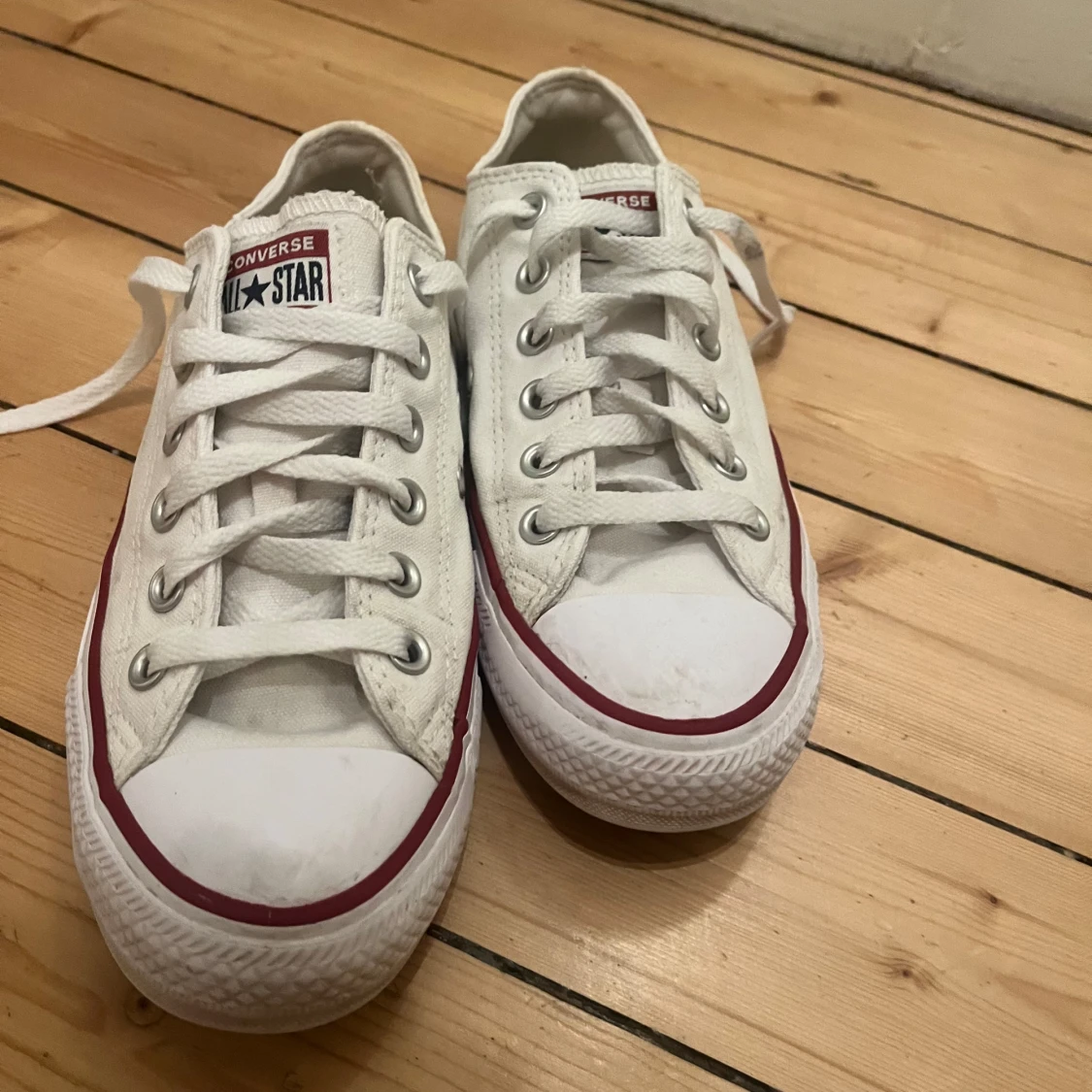 Klassiska vita Converse All Star sneakers med lågt skaft. Skorna har vit canvas, vita snören och en röd rand längs sulan. Används aldrig (vilket är anledningen till att jag säljer) och har bara används fåtal gånger.