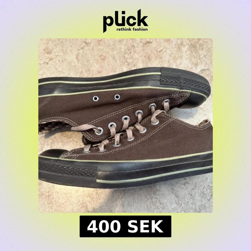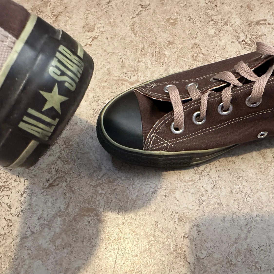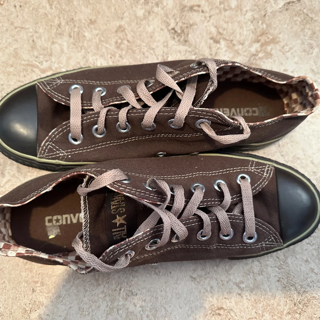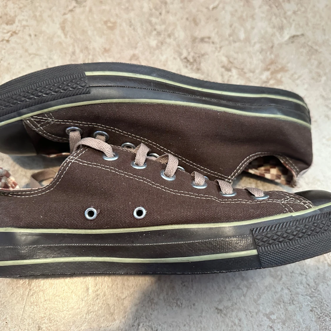 Snygga bruna Converse All Star sneakers i canvas med klassisk låg modell. Skorna har beige snörning, svart tåhätta och svart sula med ljusgrön rand. Insidan har rutigt mönster och tydlig All Star-logga på hälen. Perfekta för en avslappnad streetstil.