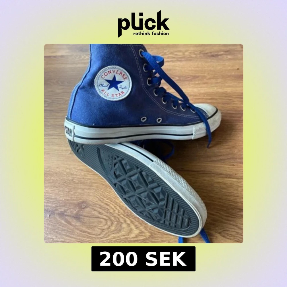 Säljer ett par klassiska blå Converse All Star sneakers med hög skaft och vit sula. Skorna har snörning och den ikoniska logotypen på sidan. Perfekta för en avslappnad stil.