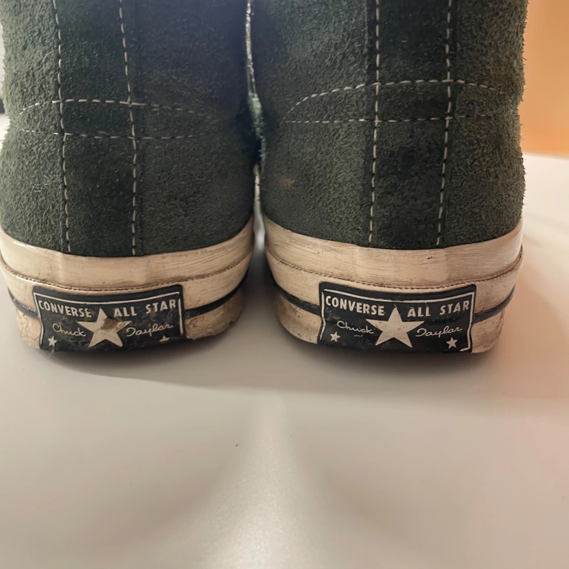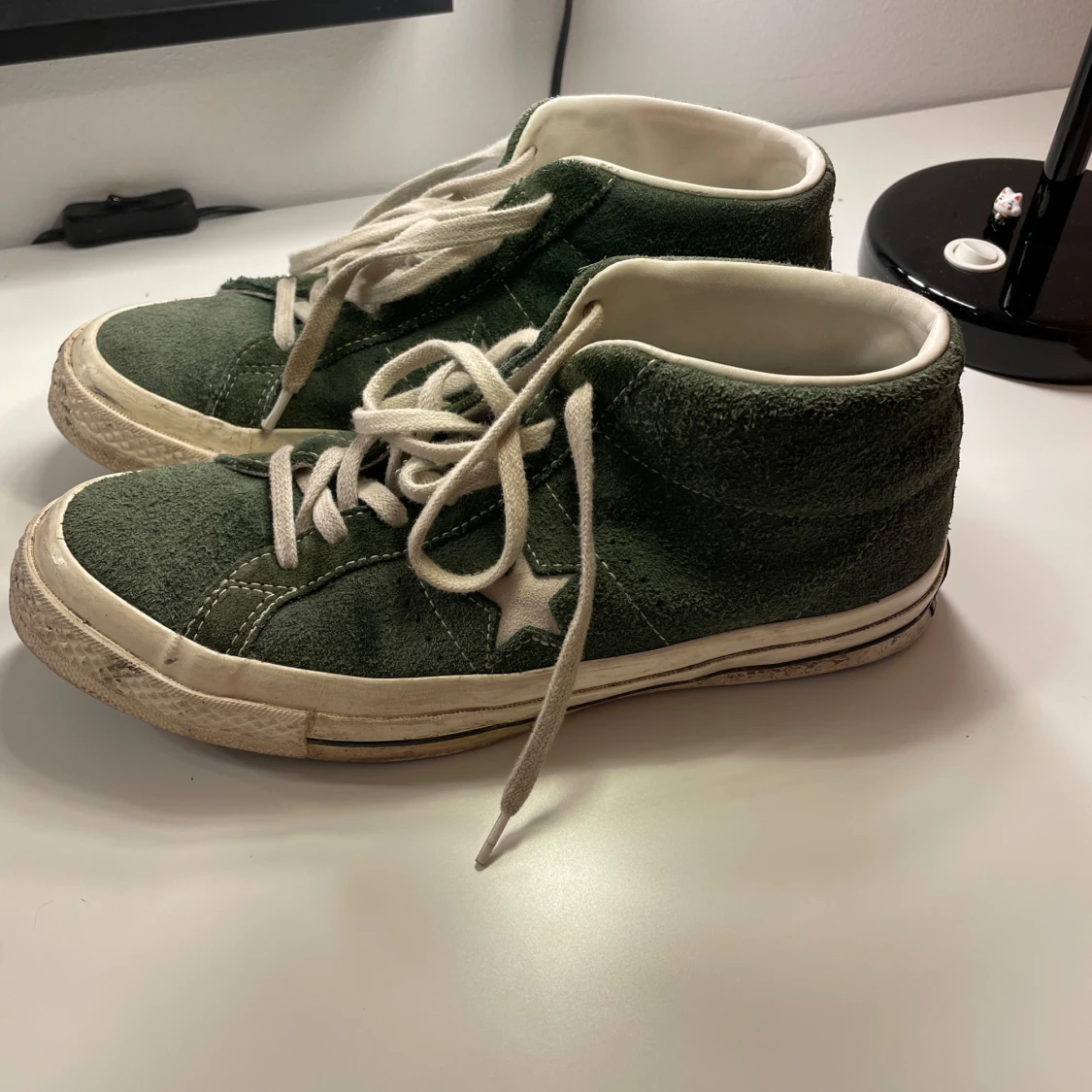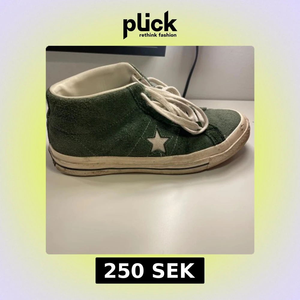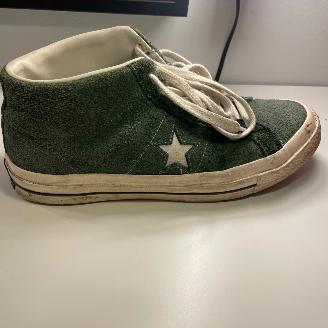 Gröna Converse One Star sneakers i mocka med vit stjärndetalj på sidan och vita snören. Klassisk retrostil med vit sula och märkning bak. Skorna har rund tå och platt sula, perfekt för dig som gillar streetwear och vill sticka ut.